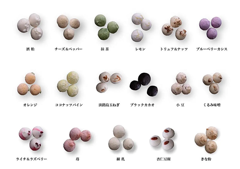 「酒粕」「チーズ&ペッパー」「抹茶」「レモン」「トリュフ&ナッツ」「ブルーベリーカシス」「オレンジ」「ココナッツパイン」「淡路島玉ねぎ」「ブラックカカオ」「小豆」「くるみ味噌」「ライチ&ラズベリー」「苺」「練乳」「杏仁豆腐」「きな粉」の全17種がラインアップしている。価格は各10個入/330円(税込)。