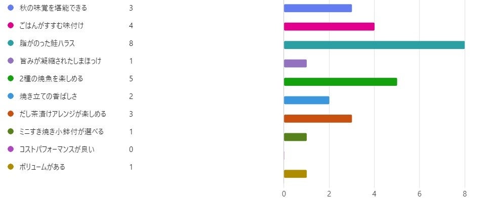 最も多くの票を集めたのは『脂がのった鮭ハラス』というポイントでした。2位は『2種の焼魚を楽しめる』、3位は『ごはんがすすむ味付け』でした。