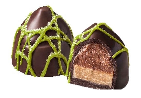 マンダリンオレンジガナッシュとアーモンドプラリネをダークチョコレートで包みました。