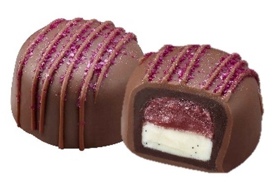 チェリーとクランベリーのガナッシュとバニラのムースをミルクチョコレートで包みました。