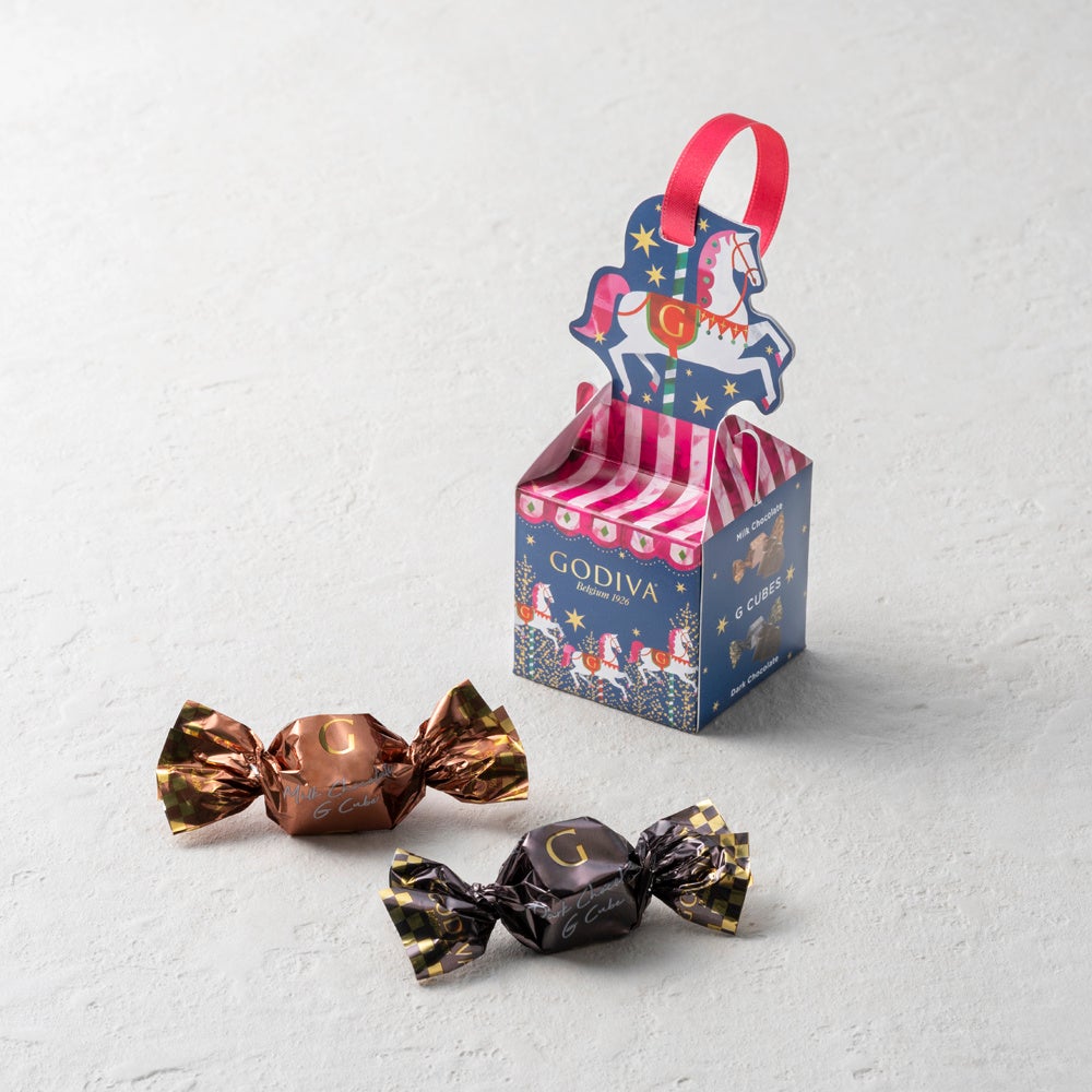 「ウィンターワンダーズ」のモチーフのひとつであるメリーゴーランドを描いたオーナメント形のパッケージに、2種類のG キューブを詰め合わせました。そのままツリーに飾ってお楽しみいただけます。