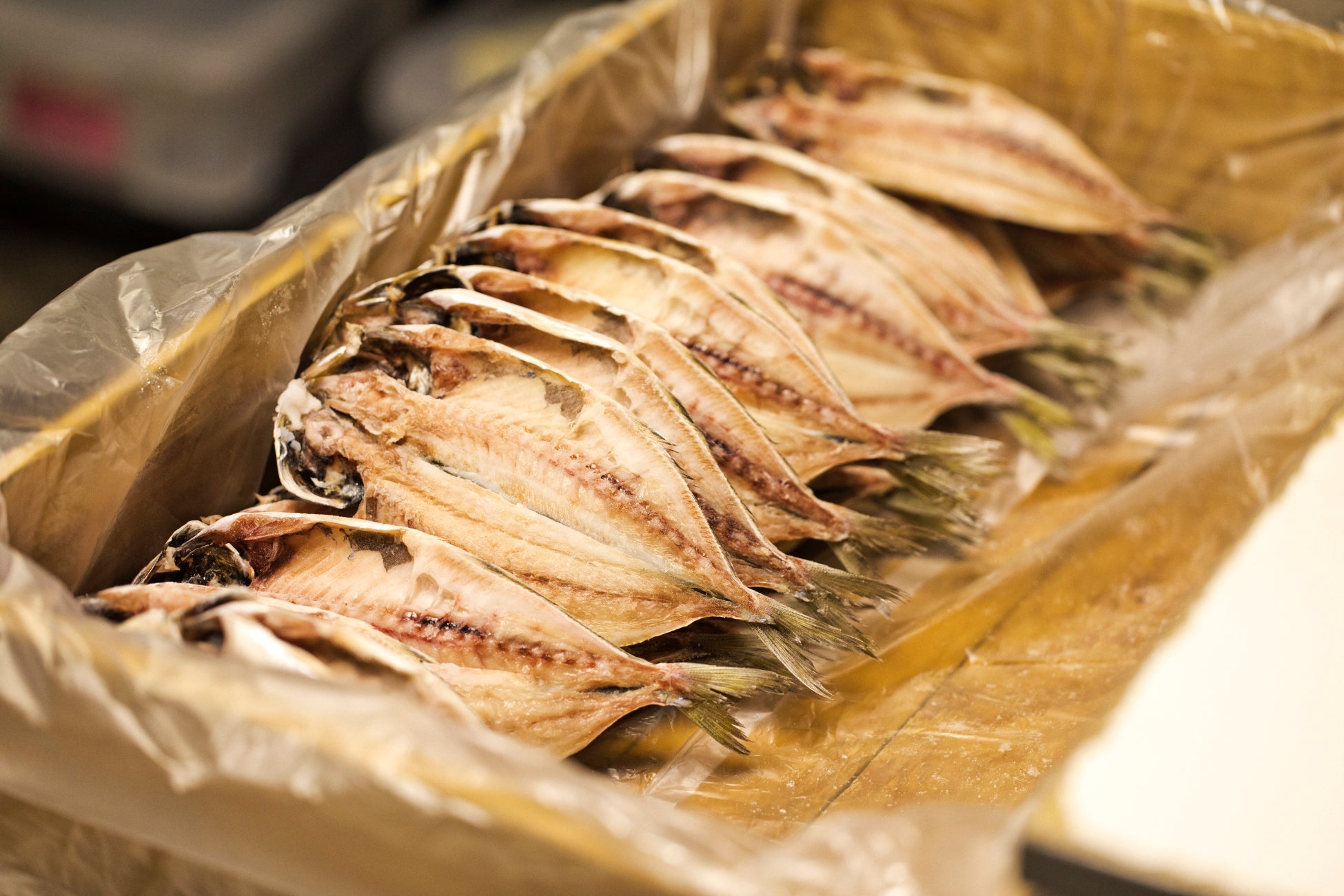 魚と塩のみで作られるひものは、その素材の質がとても重要。市場で競られたその日の魚は輝くほど美しい。刺身になる鮮度で作られるひものは数少ない。本来の前浜で水揚げした魚では、安定した生産はできなく、大きい工場であれば、材料は冷凍魚となる。その違いは仕上がったひものの姿にあわられる。