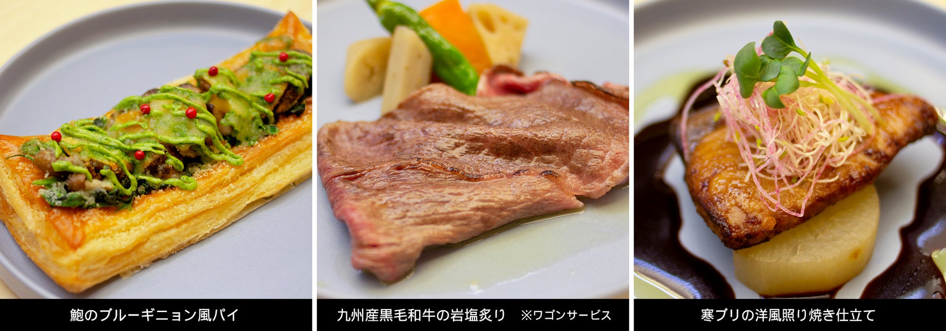 オリエンタルホテル福岡 博多ステーション(所在地:福岡市博多区)のB2F / Restaurant LINK SQUAREにて開催している「LINK SQUARE LUNCH BUFFET」では、2024年11月1日(金)より料理メニューを一新いたします。セミブッフェスタイルで楽しめる本ランチでは、3種類のメイン料理からお好みの1品をお選びいただけます。豊富なミネラルを含むヒマラヤ岩塩を使用し、お客様の目の前で上質な九州産黒毛和牛を直火で炙って仕上げる「九州産黒毛和牛の岩塩炙り」、高級食材である鮑を丸ごと、パセリ風味のブルーギニョンバターとキノコと共にパイ生地で焼き上げた「鮑のブルーギニョン風パイ」、脂の乗った寒ブリを赤ワインとフォンドヴォーベースのソースで洋風に仕上げた「寒ブリの洋風照り焼き仕立て」、これら3種類のメイン料理をどれもシェフが自信をもってご提供いたします。