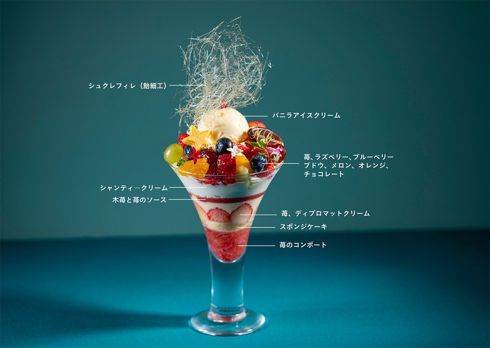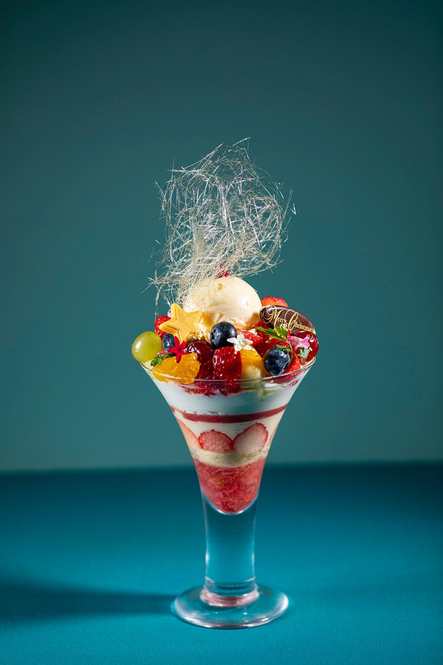 今回ご用意したのはこの季節ならではの赤や白のクリスマスカラーが心躍るシーズンパフェ。苺のコンポートやスポンジケーキ、ディプロマットクリーム、木苺と苺のソース、バニラアイスクリームなどひとつのグラスに多彩な味わいを重ね、クリスマスツリーの煌めくオーナメントのようにフルーツ、トップには雪降るシュクレフィレ(飴細工)を華やかに彩りました。