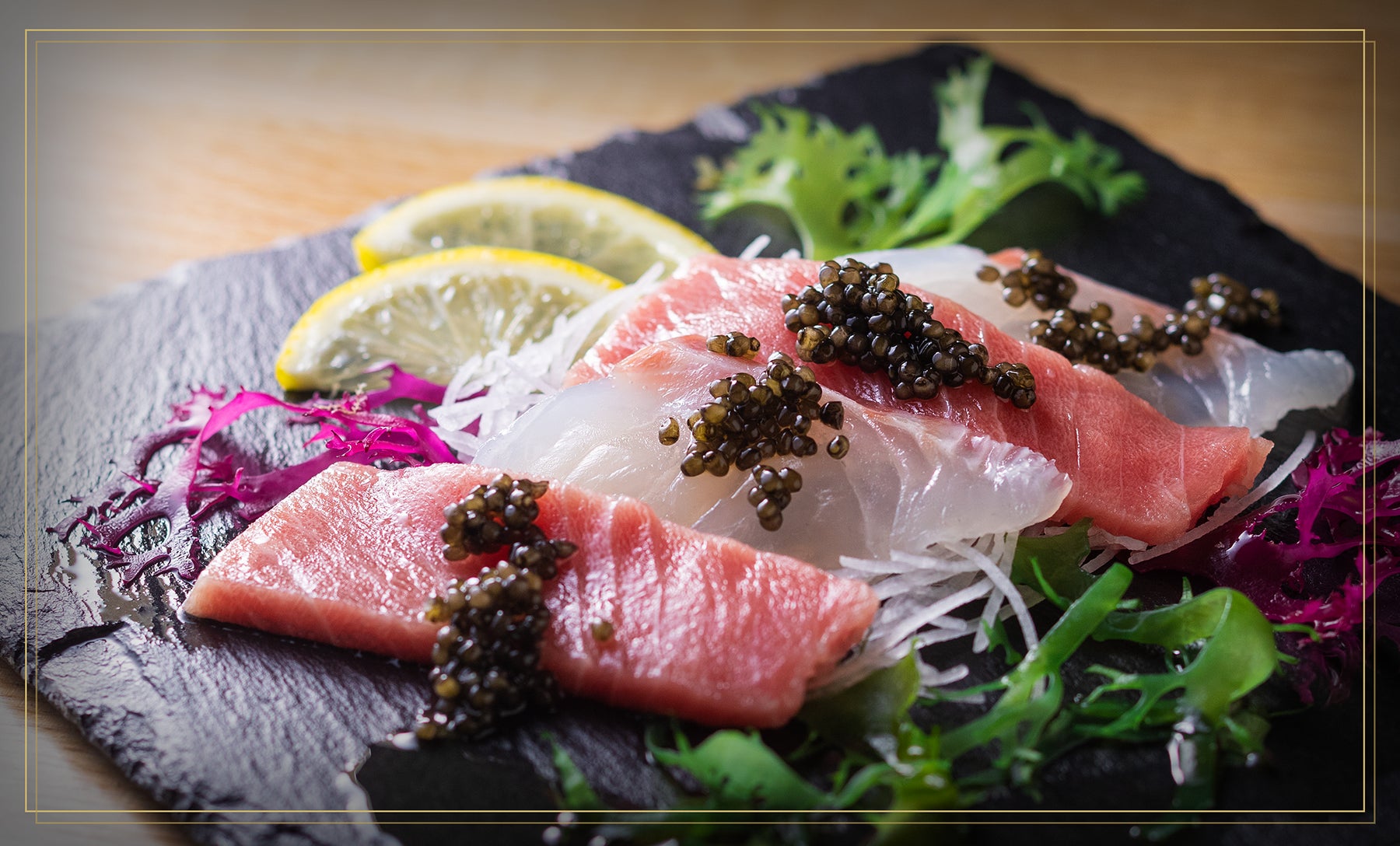 新鮮なマグロと真鯛が織りなす極上のカルパッチョに、海の宝石キャビアを贅沢に添えて。口の中で広がる至高の味わいをご堪能ください。