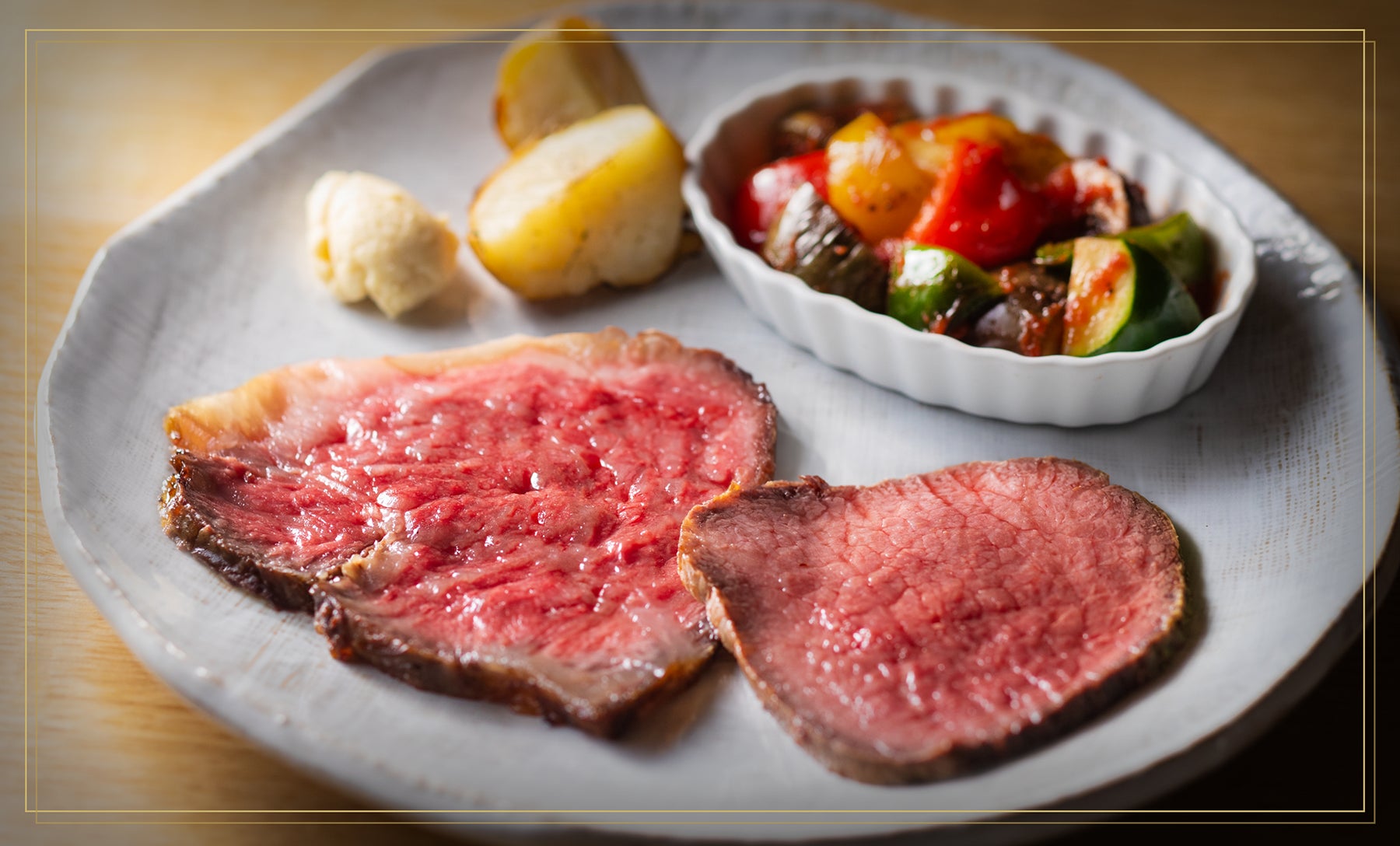 創業1971年、和牛の旨みを探求してきた鎌倉山のスペシャリテ。上質な黒毛和牛の魅力を味わえるローストビーフ。異なる2種の部位を贅沢に使い、記憶に刻まれる味わいの一皿をお届けします。