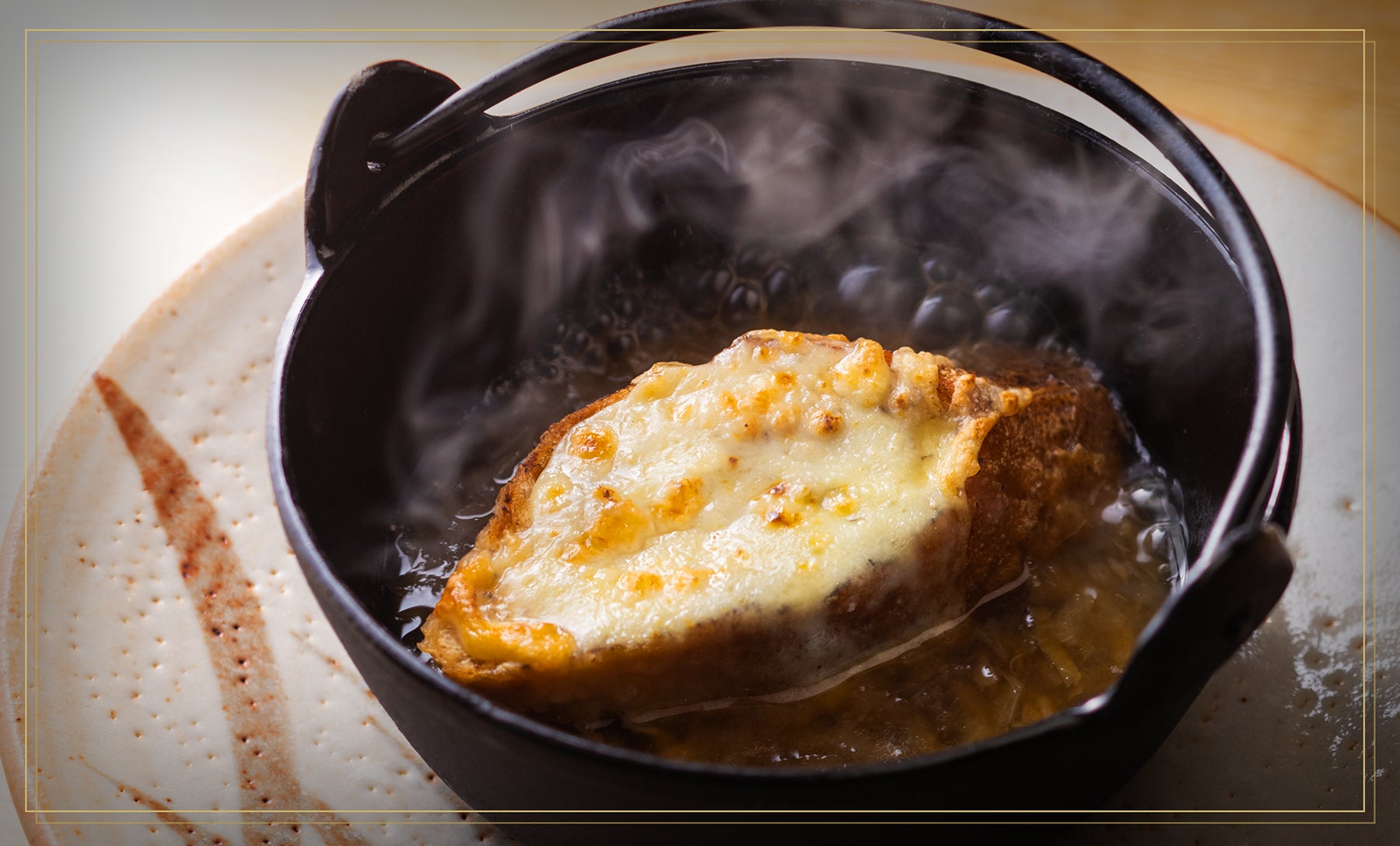じっくりと煮込んだ甘み豊かな玉ねぎを使用し、奥深い味わいが広がり、鉄鍋で提供する豊潤なオニオングラタンスープです。とろけるチーズと香ばしいバゲットが、冬ならではの豊潤で奥深い味わいを際立たせます。