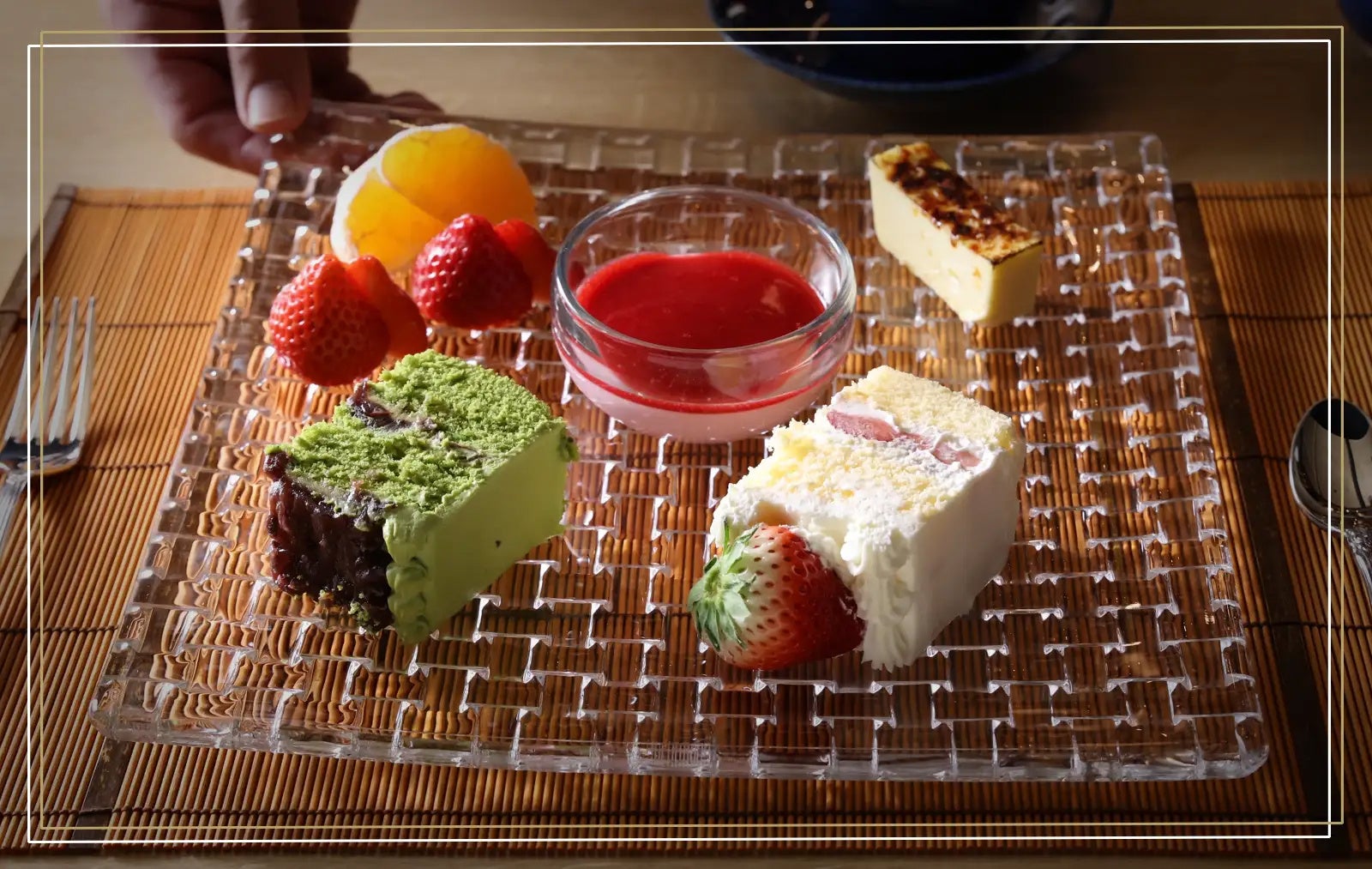 食後のデザートは、季節のケーキをはじめとする数々の逸品から、お好きな物を盛り合わせ致します。