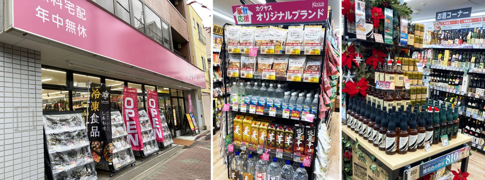 ウイスキーや高コスパワインなど、酒類専門店ならではの品揃えをさらに強化し、お客様に選ぶ楽しさをご提供します。「お酒だけじゃない!カクヤス」の展開として、酒類と相性の良いおつまみや冷凍食品も取り揃え、お客様に様々なシーンで当店をご利用いただけるような店づくりを行ってまいります。当社のオリジナルブランド「Kprice(ケープライス)」の商品もぜひお試しください。