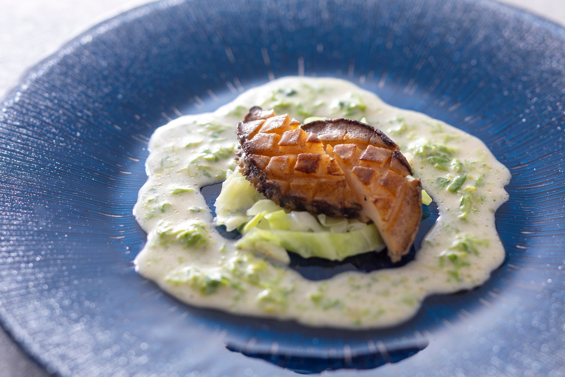 ・活鮑の鉄板焼 あおさ海苔香る白ワインのクリームソース