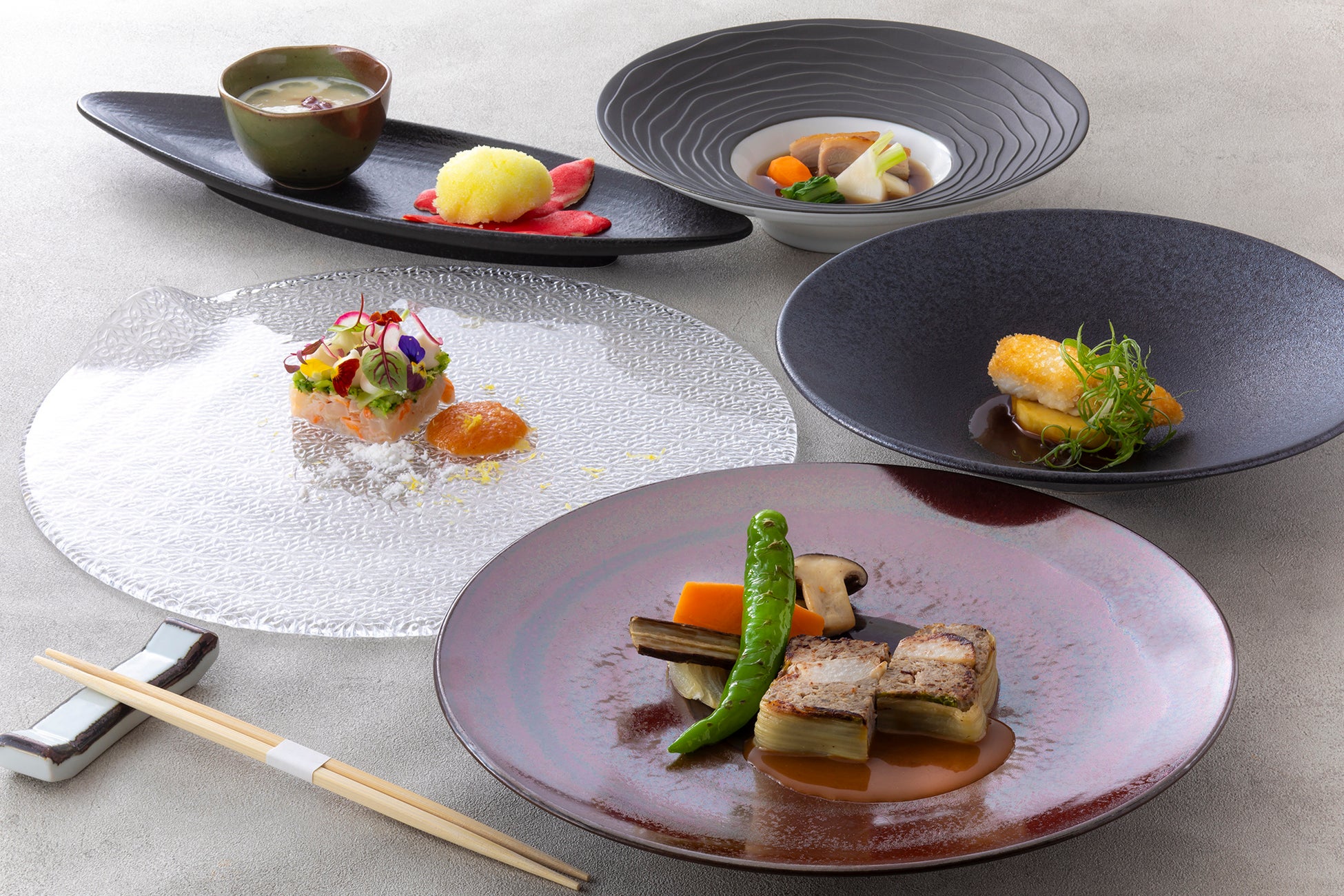 リーガロイヤルホテル京都伝統の味を再現したメニューや、シェフが研修時代に学んだ思い出の味などを取り入れた「開業55周年記念メニュー」は、55周年の歴史を紡いできた一員である各シェフが贈る至高のメモリアルプレートです。