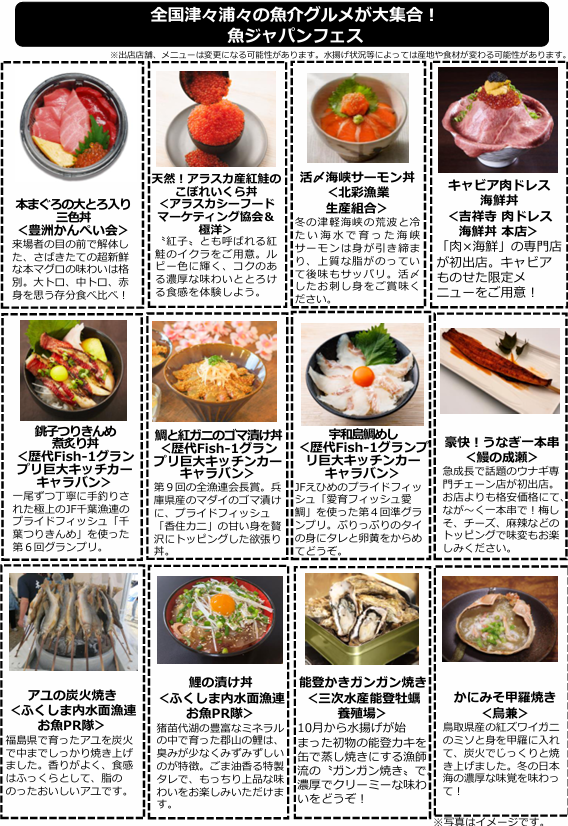 東日本大震災からの復興応援を目的に、「常磐もの」と呼ばれる福島の魚介を使った料理が味わえる「発見!ふくしまお魚まつり」(主催・発見!ふくしまお魚まつり実行委員会)を同時開催。北海道・東北エリアの厳選した魚介料理を集めた「食べて応援!ニッポンの幸エリア」(特別協力・発見!ふくしまお魚まつり実行委員会)も開設。最終日の4日には、来場者と審査員の投票でグランプリを決定する国産水産物を使った魚料理のコンテスト「第10回Fish-1グランプリ」(主催・国産水産物流通促進センター構成員 全国漁業協同組合連合会)も同時開催します。