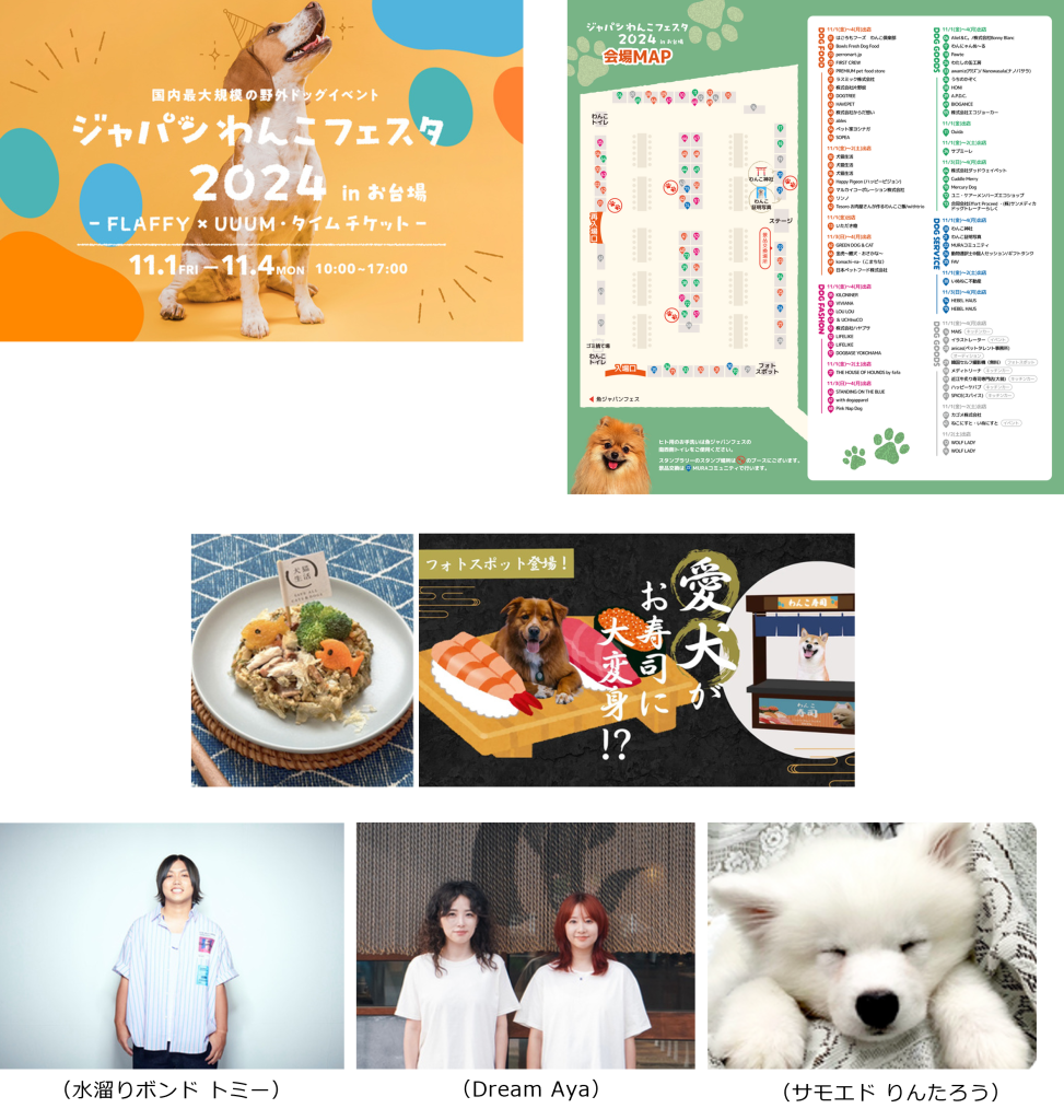 ワンちゃんと飼い主さんが一緒に楽しめるイベント「ジャパンわんこフェスタ2024 in お台場ー FLAFFY × UUUM・タイムチケットー」が11月1~4日に、隣接する特設会場で同時開催されます。ドッグフードや洋服など約60ブースが並ぶ「わんこマルシェ」やワンちゃんが映えるフォトスポット、 飲食エリアのほか、ワンちゃん好きの著名人やクリエイターによるステージプログラムなど、ワンちゃんと一緒に楽しめるコンテンツが盛りだくさん!愛犬と一緒に魚介グルメや買い物を楽しめる、今までにない魚介グルメフェスとドックイベントの融合を、ぜひ会場でお楽しみください。