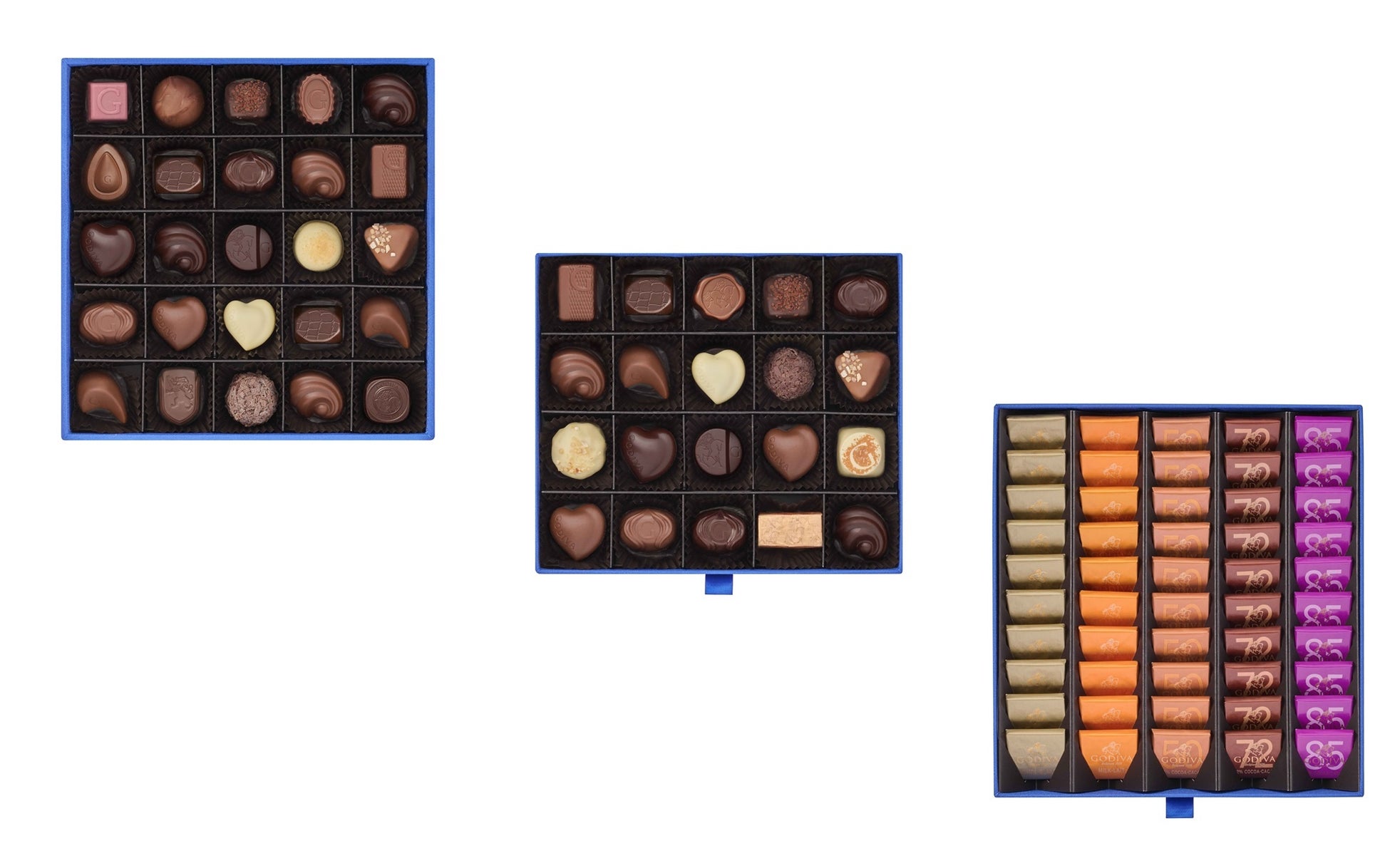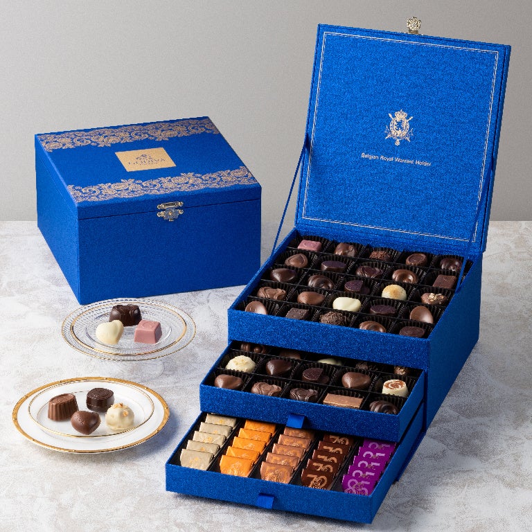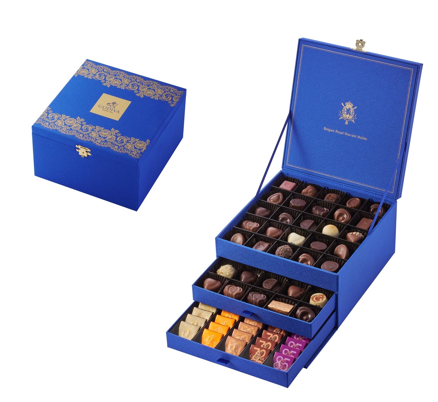 ベルギー王室御用達ブランドとして長きにわたり伝統を継承し、革新を重ねてきたゴディバならではのプレミアムコレクションです。ベルギー王女の名前から命名されたチョコレートをはじめ、ゴディバの歴史を語るに欠かせないアートのように美しいチョコレートの数々やシンプルで繊細なカレなど珠玉の95粒を、中世の時代に「編まれた宝石」と呼ばれたベルギーのレースをモチーフとしてあしらった、気品溢れるロイヤルブルーのボックスに贅沢に詰め合わせました。特別なひと箱と共に、大切な方との素敵な時間をお過ごしください。