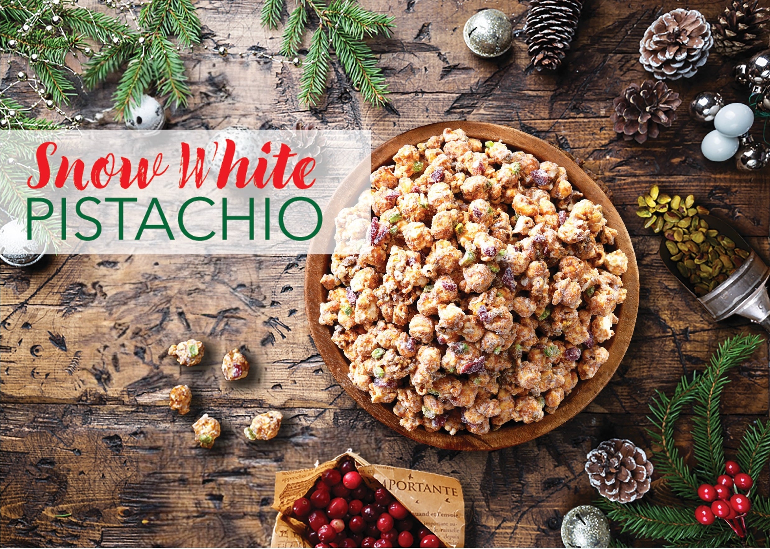 『スノーホワイト ピスタチオ』は、たっぷりのローストしたピスタチオをキャラメルコーティングした「ピスタチオ キャラメルクリスプ™」に、雪をイメージしたホワイトチョコレートと、彩りも鮮やかなドライクランベリーを組み合わせた贅沢レシピです。熱々のキャラメルを専用の銅窯で煮立てるところから、一粒一粒のコーティングまで手作業で丁寧に仕上げています。