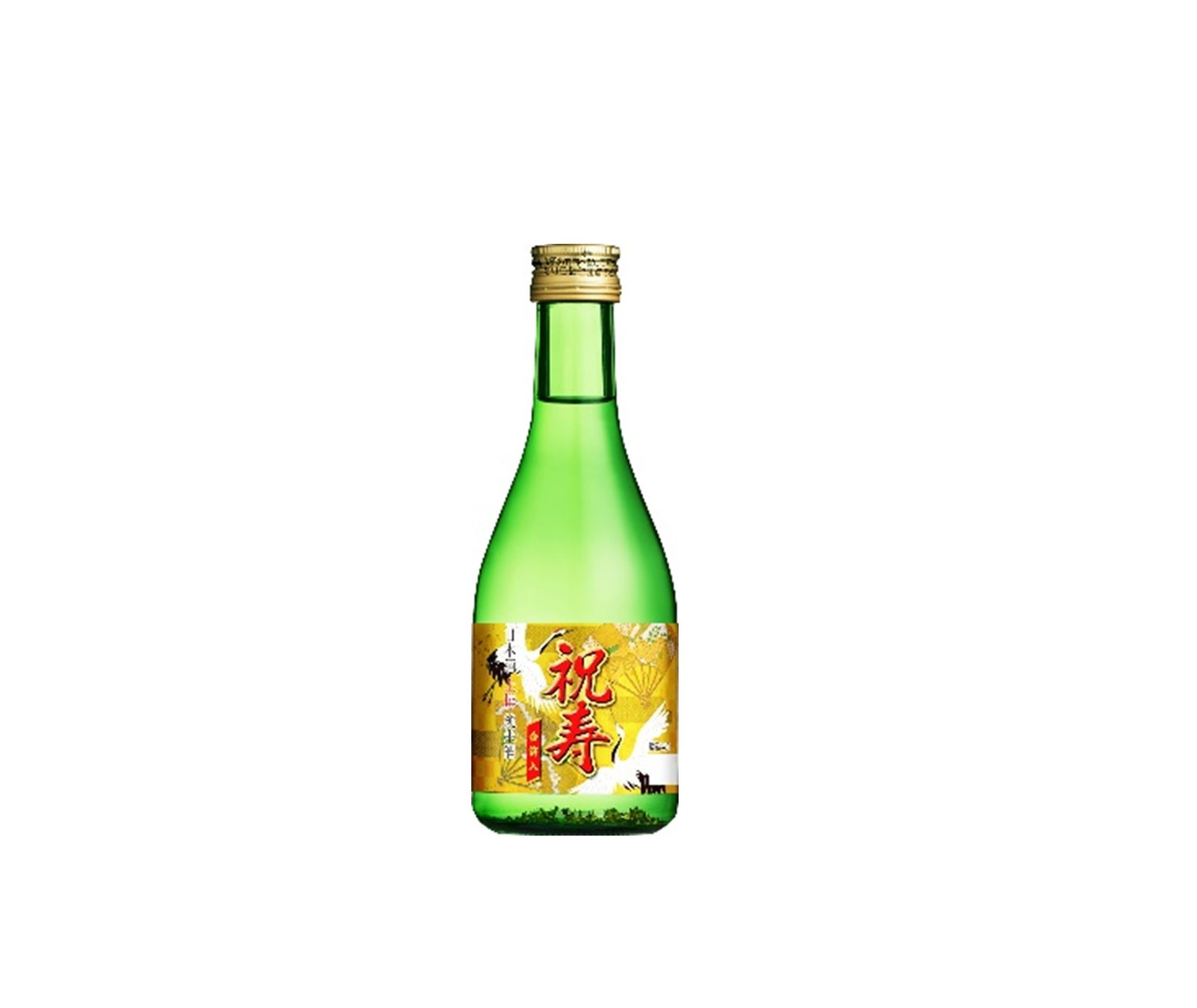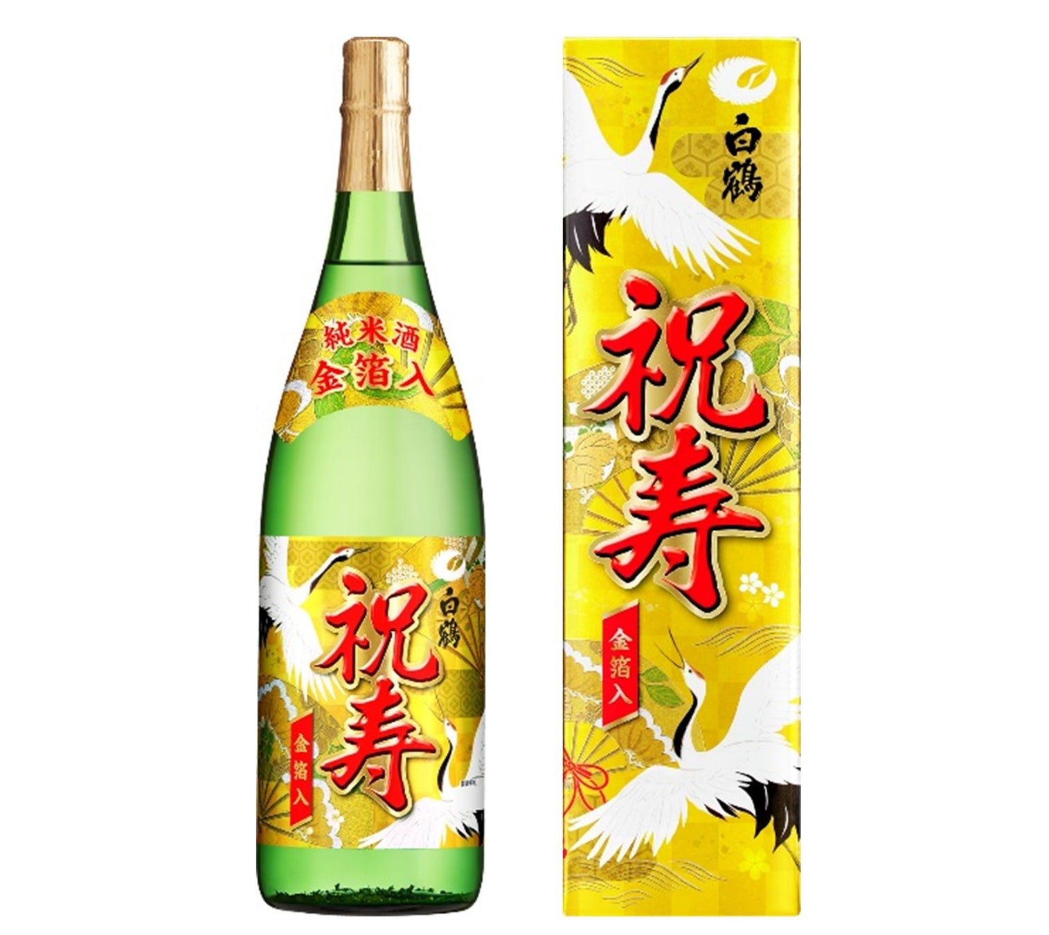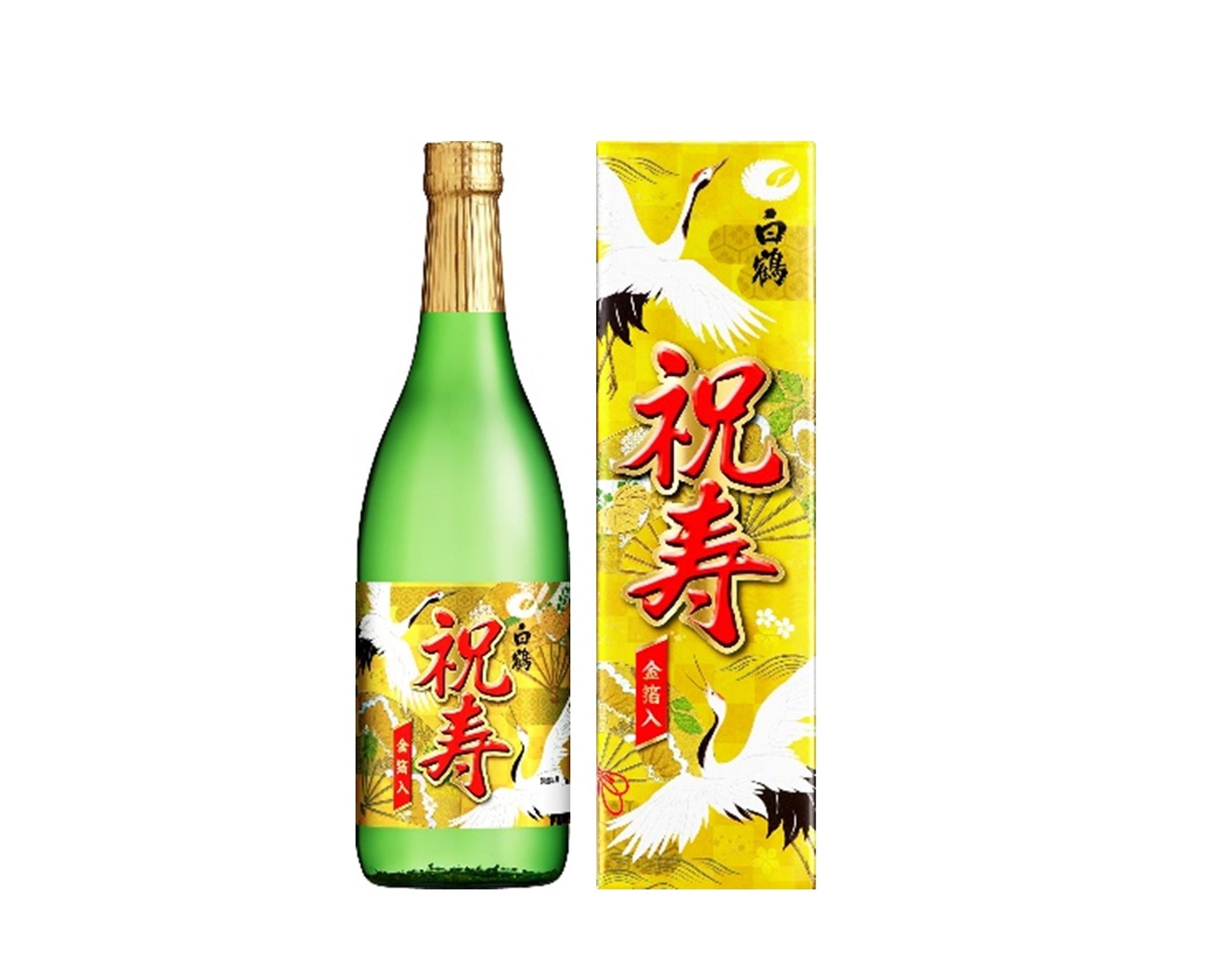 米と米こうじ、水だけで仕込んだまろやかですっきりとした後味が特長の純米酒に、華やかな金箔を加えました。「祝寿」の名にちなみ、鶴などの長寿の象徴やおめでたいモチーフで華やかに飾りたて、金箔の屏風絵のような優雅な世界観を演出し、高級感を高めた煌びやかな意匠に仕上げました。