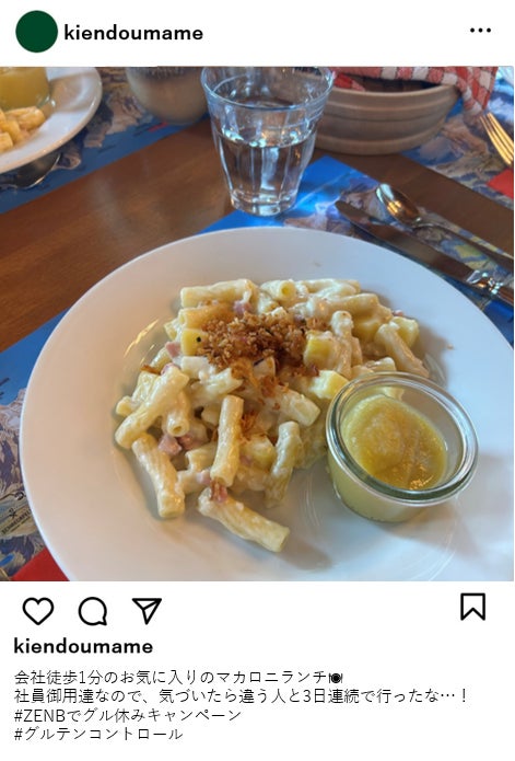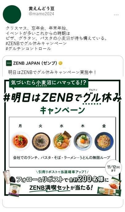 ②公式アカウントからのキャンペーン投稿をエピソードとハッシュタグ「#ZENBでグル休みキャンペーン」「#グルテンコントロール」をつけて引用リポスト。