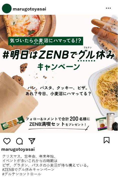 株式会社ZENB JAPAN(ゼンブ ジャパン)(愛知県半田市、以下ZENB)は、おいしいパンやパスタ、クッキーをついつい食べ過ぎてしまい、「明日は小麦のグルテンをお休みしよう」と心に決めたエピソードを投稿してもらう「#明日はZENBでグル休みキャンペーン」を2024年10月29日(火)から11月12日(火)まで開催します。「あるある」と思わずうなずくエピソードを投稿してくれた合計200名に、おいしくグルテンフリーを満喫できるZENB商品やグッズの詰め合わせをプレゼントします。