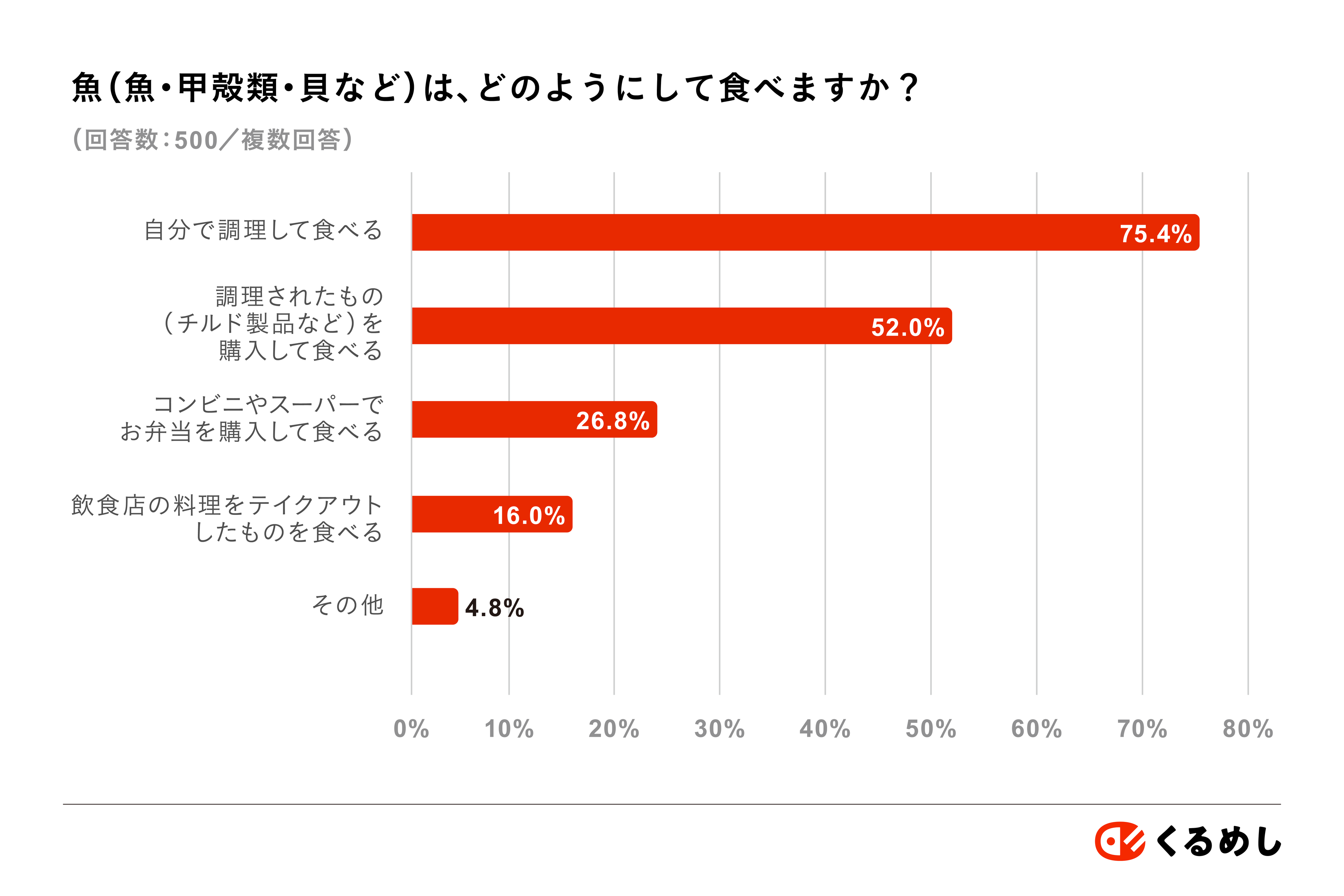 「魚(魚・甲殻類・貝など)は、どのようにして食べますか?(複数回答)」と、自宅での魚の食べ方に関する設問に対しては、75.4%の人が「自分で調理して食べる」と回答しました。一方で「調理されたものを購入して食べる」と回答した人が52.0%で、「コンビニやスーパーでお弁当を購入して食べる」と回答した人は26.8%という結果でした。
