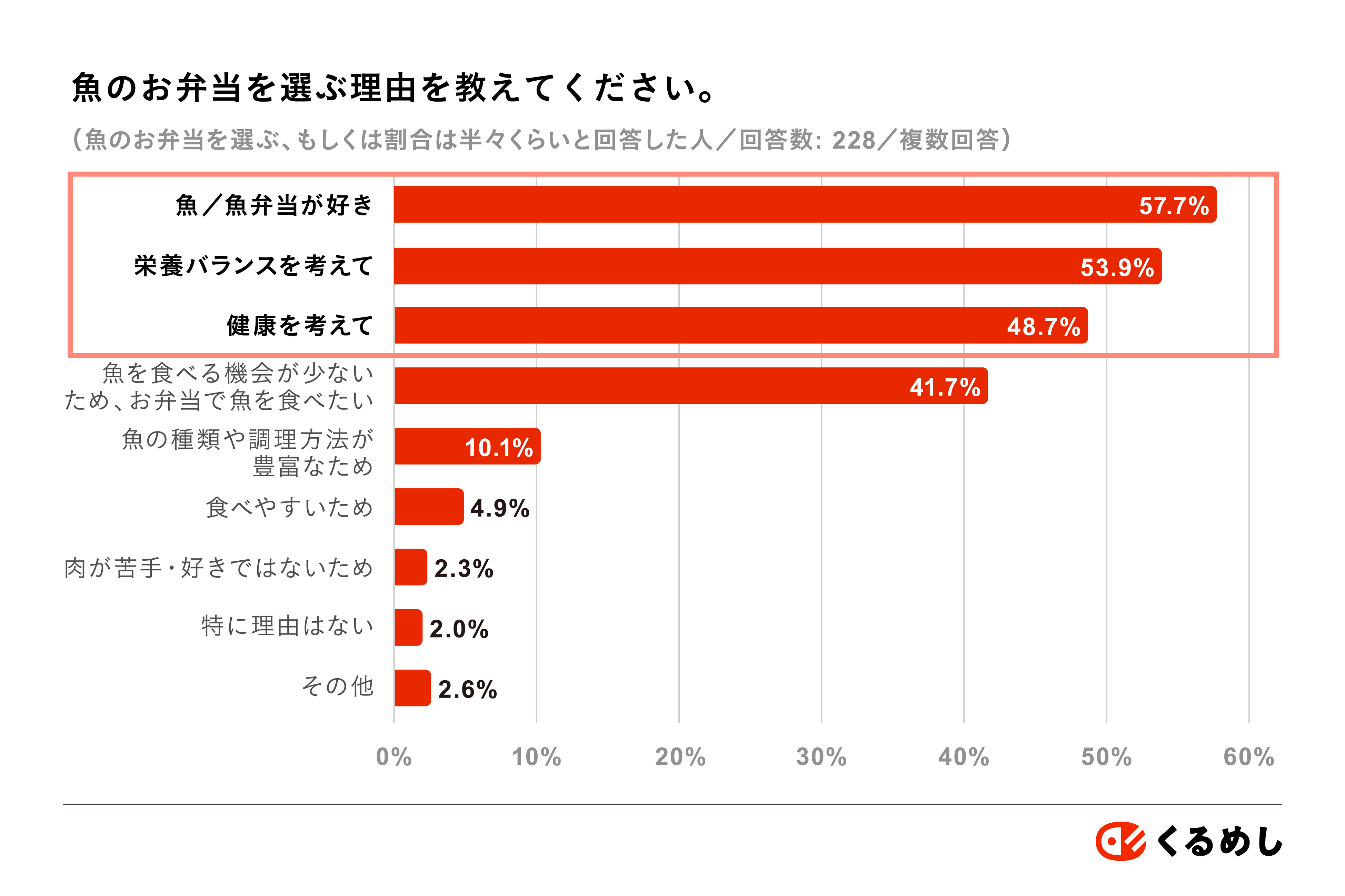 魚のお弁当を選ぶ理由として一番多い回答は「魚/魚弁当が好き(57.7%)」でしたが、その他、「栄養バランスを考えて(53.9%)」「健康を考えて(48.7%)」という回答が多く、「魚を食べる機会が少ないため、お弁当で魚を食べたい(41.7%)」という回答もみられました。