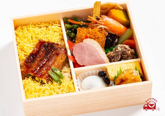 厳選された鰻の蒲焼やA5黒毛和牛のしぐれ煮が自慢の和食弁当。錦糸卵が敷き詰められたせいろおこわの上にのったメインの鰻が目を惹きます。豚串カツ、厚焼き玉子、煮物など様々な忠正で人気の高い副菜が詰め込まれています。さらに、有頭海老や鴨のロースなど贅沢な食材を使った副菜もお楽しみいただける贅沢なお弁当です。和菓子まで詰め合わされ、最後まで贅沢な逸品。