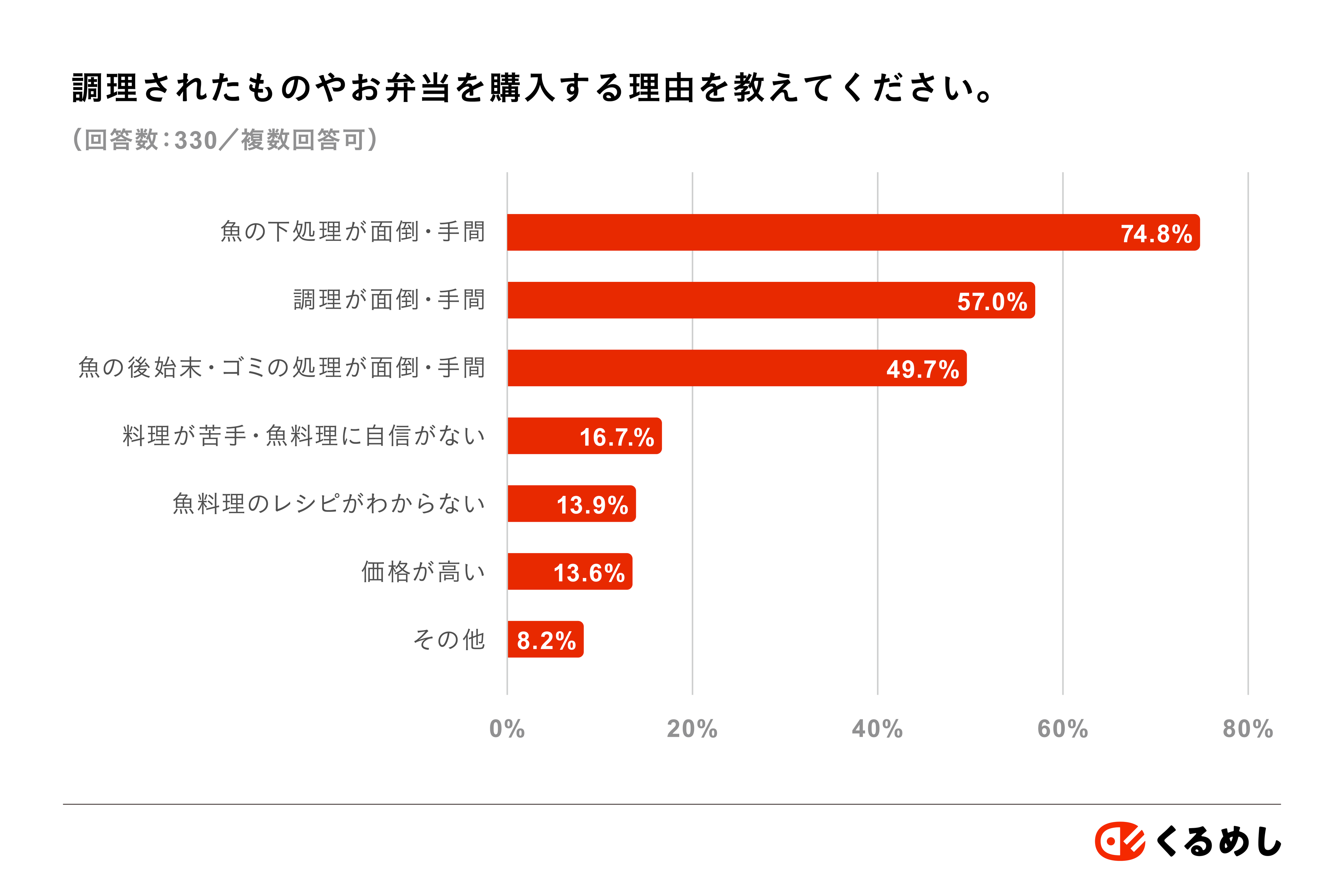 また、調理されたものやお弁当を購入する理由として「調理された魚料理を購入して食べる理由を教えてください。(複数回答)」と聞いたところ、「魚の下処理が面倒・手間(74.8%)」「調理が面倒・手間(57.0%)」「魚の後始末・ごみ処理が面倒・手間(49.7%)」が回答として多く挙げられました。その他、自由回答では、「料理をする時間がない」「時間の節約のため」などの回答もみられました。