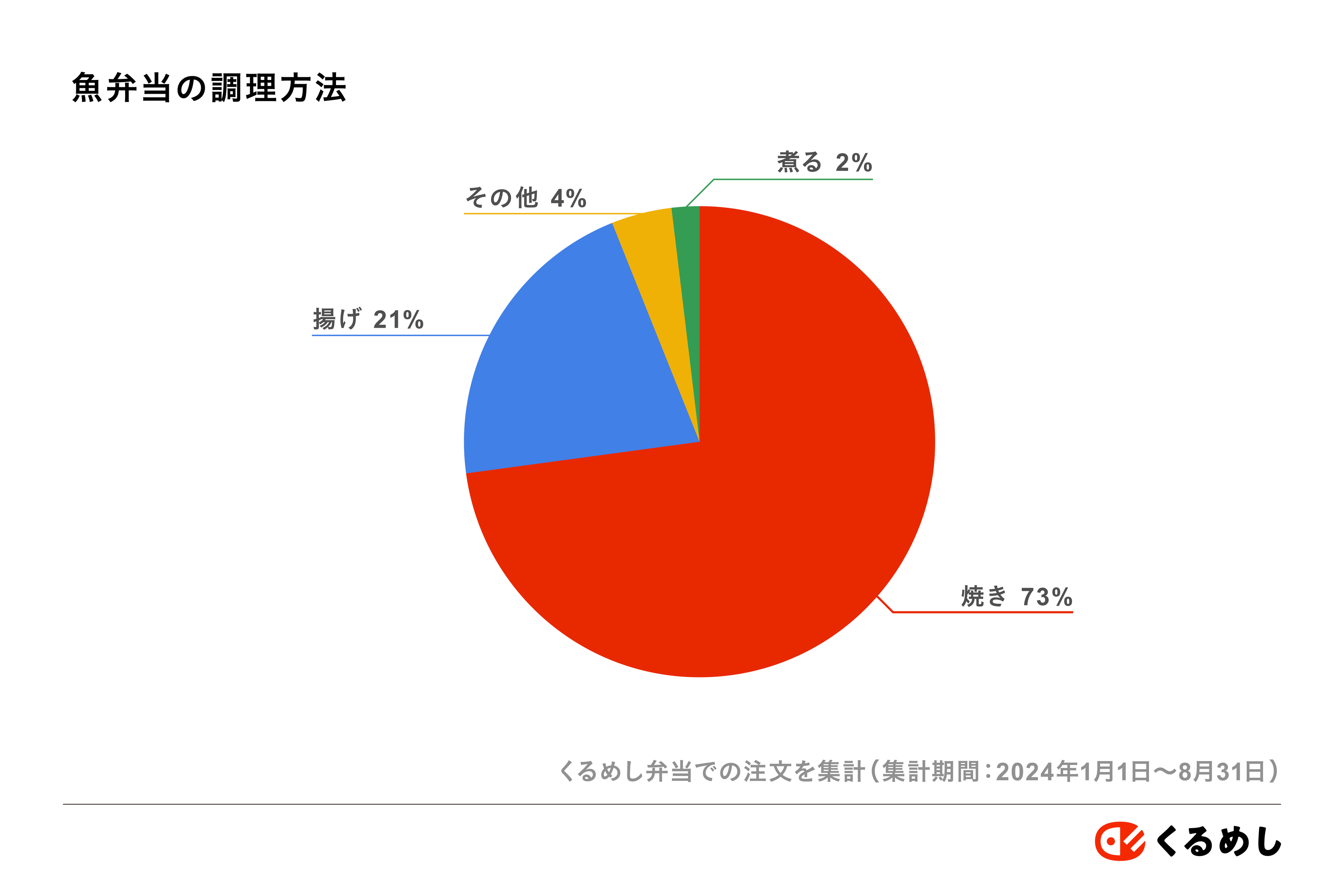 当社サービスで、今年1月から8月までに注文されたお弁当を集計したところ、実際に魚類のお弁当に使われている魚の種類で多いのは、「鮭(サケ)」「海老(エビ)」「鯖(サバ)」でした。また、調理方法としては、73%が「焼き」という結果でした。(集計期間:2024年1月1日~8月31日)