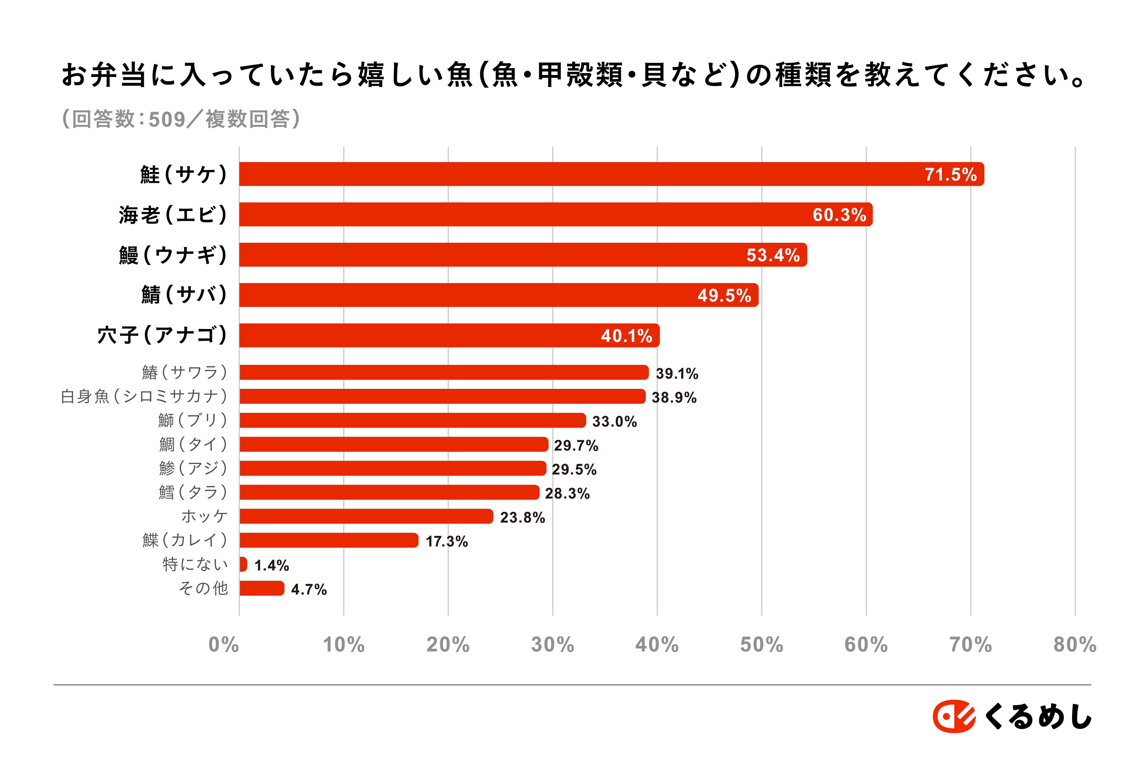 「お弁当に入っていたら嬉しい魚(魚・甲殻類・貝など)の種類を教えてください。(複数回答)」と聞いたところ、「鮭(サケ)(71.5%)」「海老(エビ)(60.3%)」「鰻(ウナギ)(53.4%)」「鯖(サバ)(49.5%)」「穴子(アナゴ)(40.1%)」という回答が集まりました。