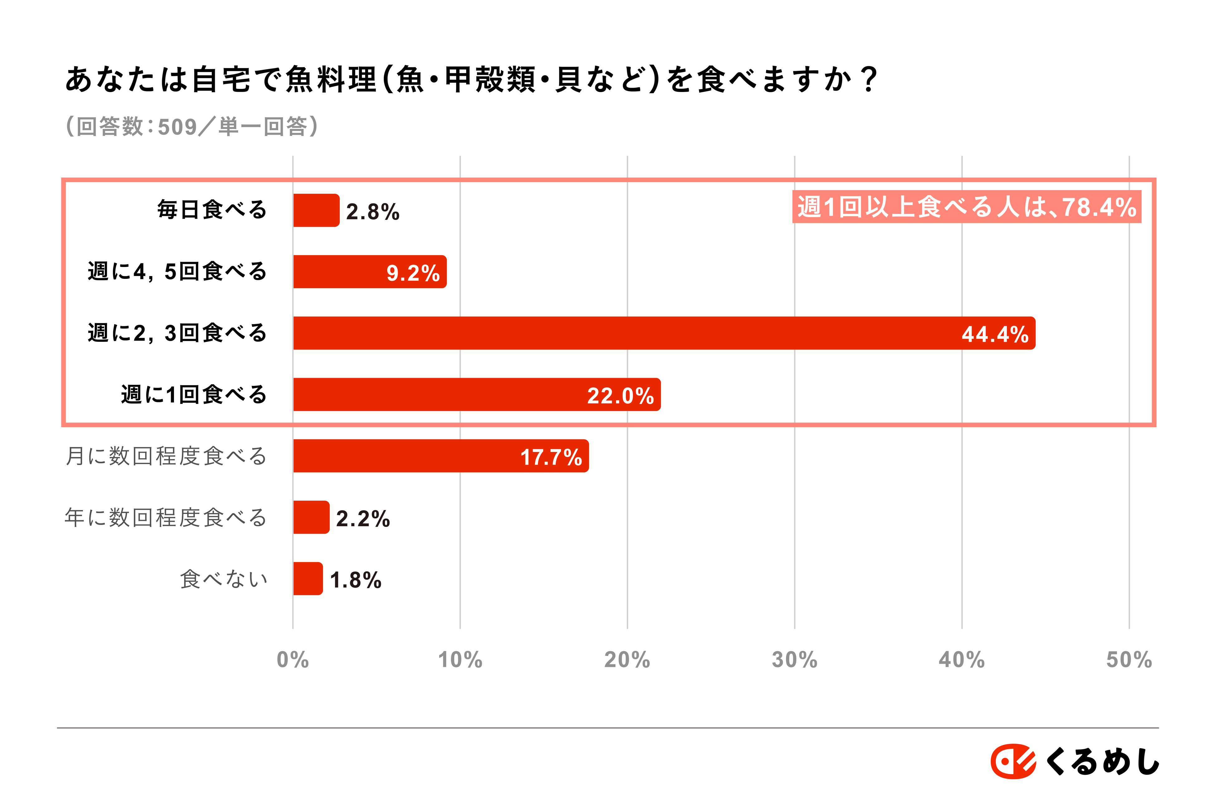 「自宅で魚料理を食べますか?」の設問に対する回答は、「毎日食べる(2.8%)」「週に4,5回食べる(9.2%)」「週に2,3回食べる(44.4%)」「週に1回食べる(22.0%)」と、全体で78.4%は週に1回以上魚を食べている人がいることがわかりました。