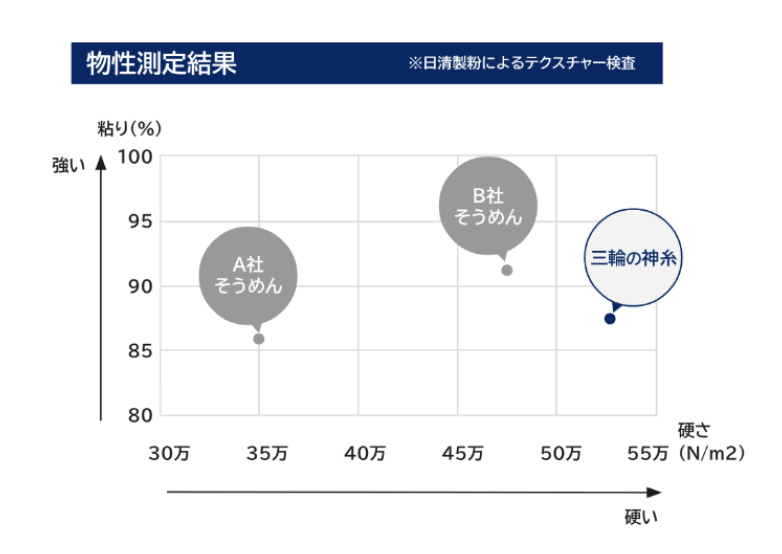 『三輪の神糸』は素麺の中でも”硬さ”があるため、多彩な料理アレンジにもオススメです。硬さが強い素麺は、ゆでた後に時間経過しても弾力が残り、のどごしが良くつややかで、コシのある食感が楽しめます。