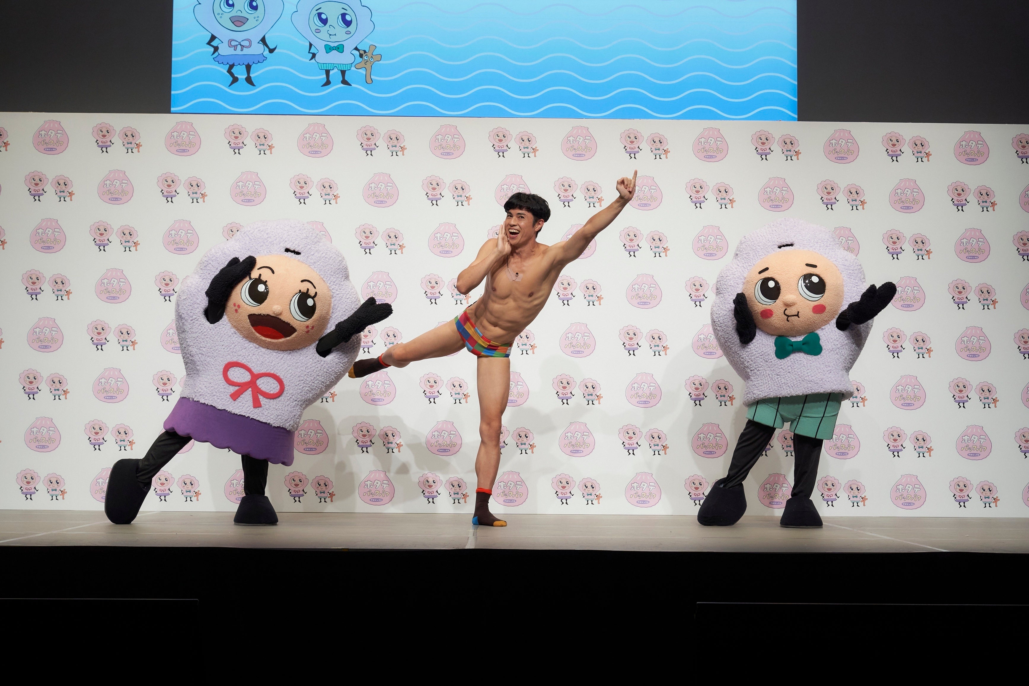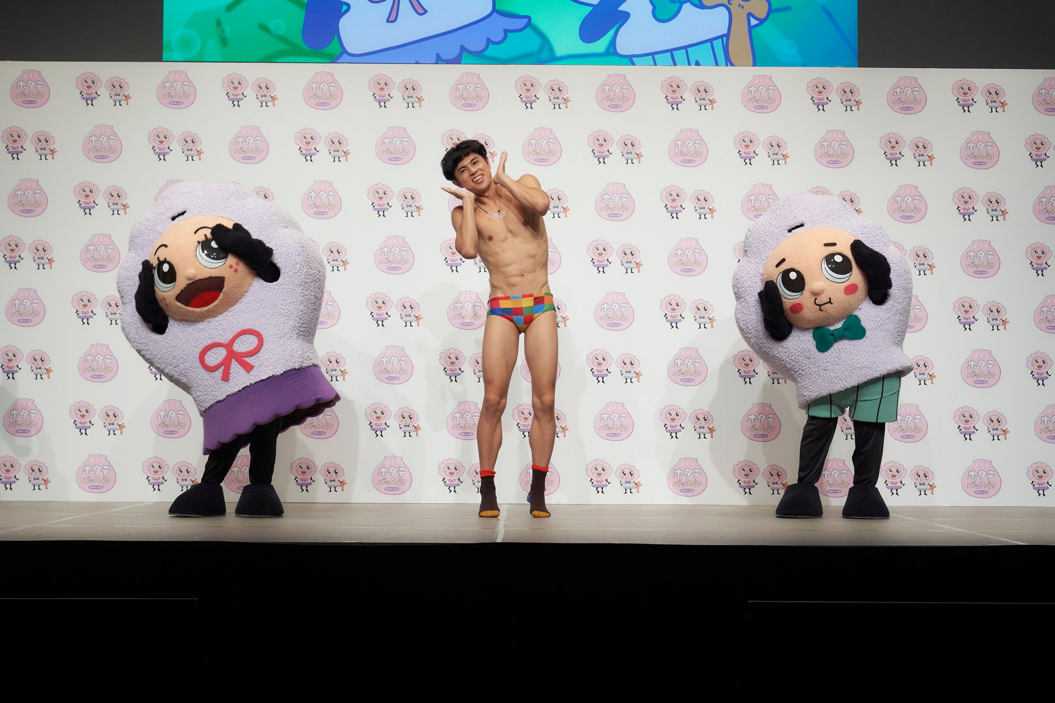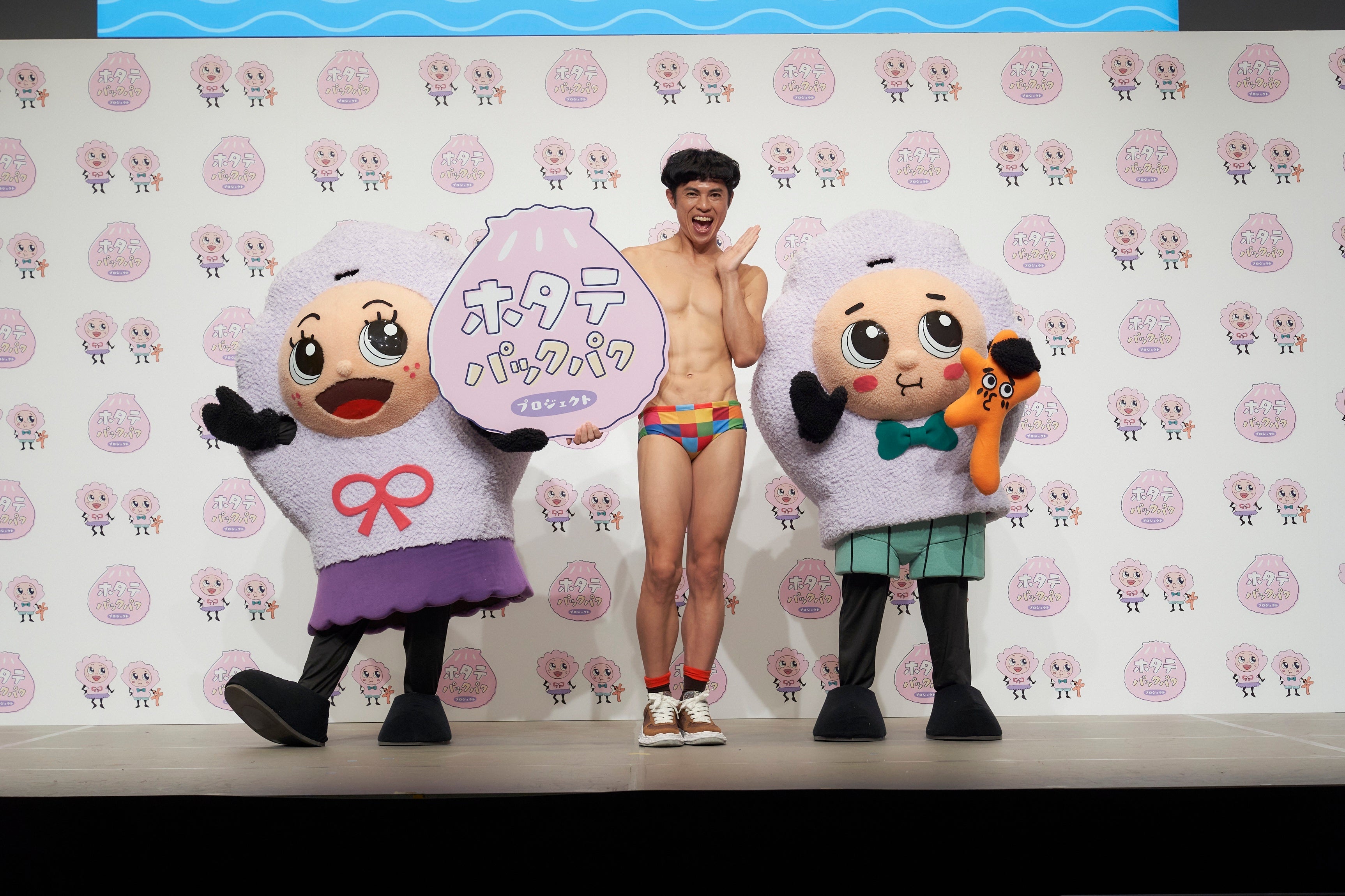 いつもの海パン姿ではなく、「ホタテをイメージした」という白シャツ×ピンクのパンツ姿で勢いよく登場した小島さん。「今日はホタテっぽく、でっぷりした髪型にしてもらいました。ここまでホタテに近づけるなんて相性いいですね。みんなにホタテの魅力を伝えられたらと思います!」と語り、イベントがスタートしました。この日が初披露目となったホタテ姉弟キャラクターのタッティちゃん&カイくんの印象を聞かれ、「めちゃくちゃ可愛らしいですよね!横から見ると顔が立体的になっているんですよね。栄養をたっぷり含んでいる感じが伝わります。」と絶賛しました。