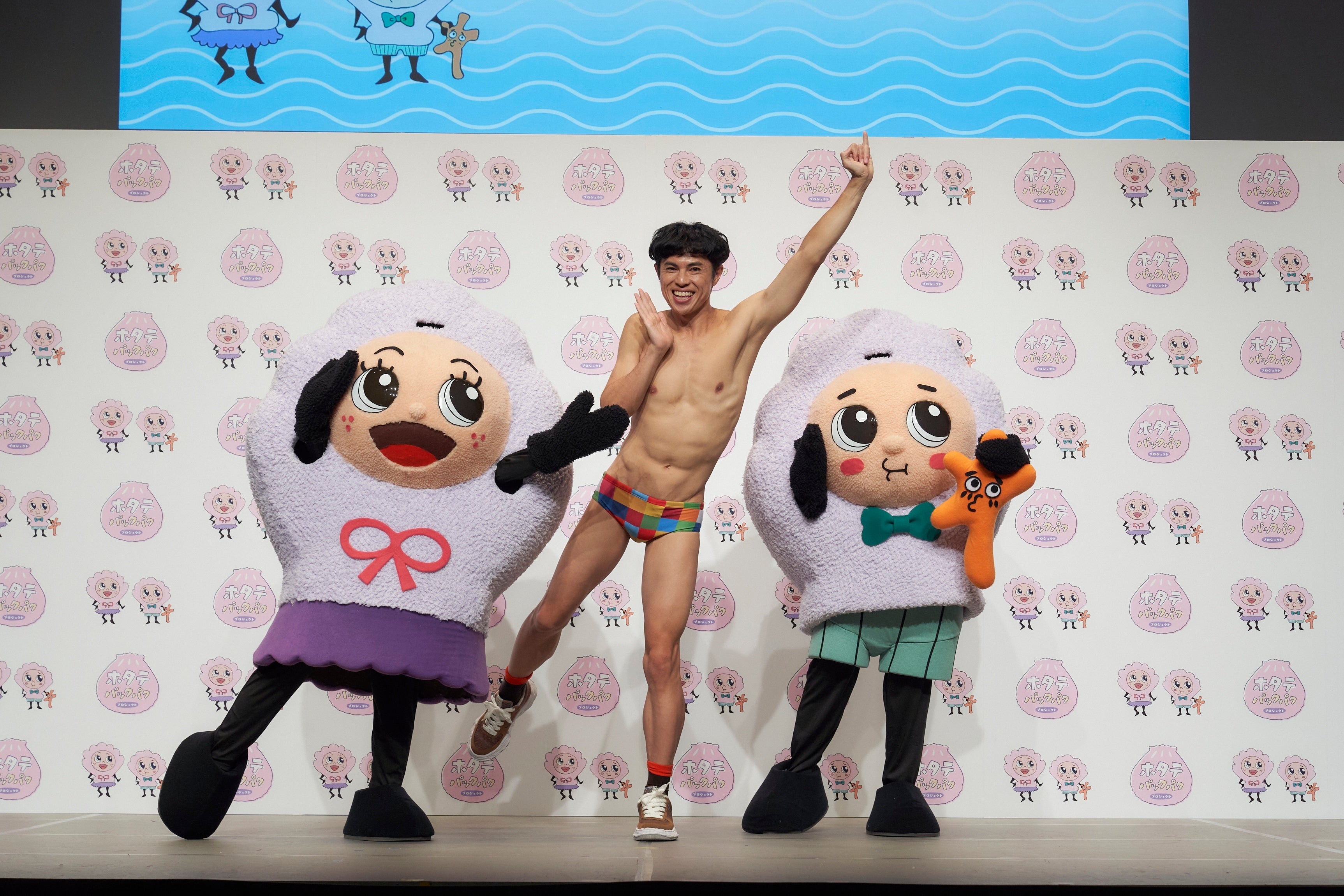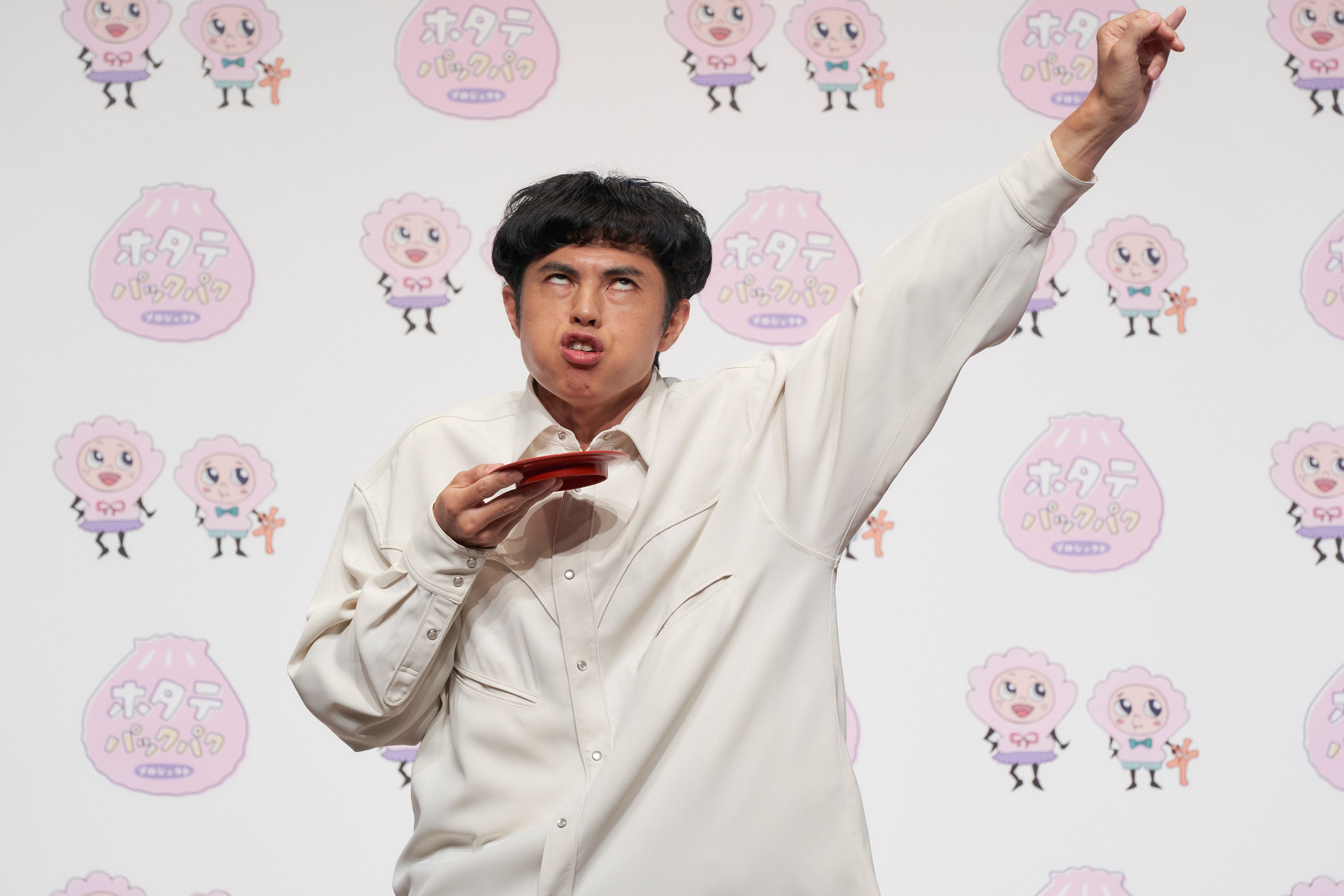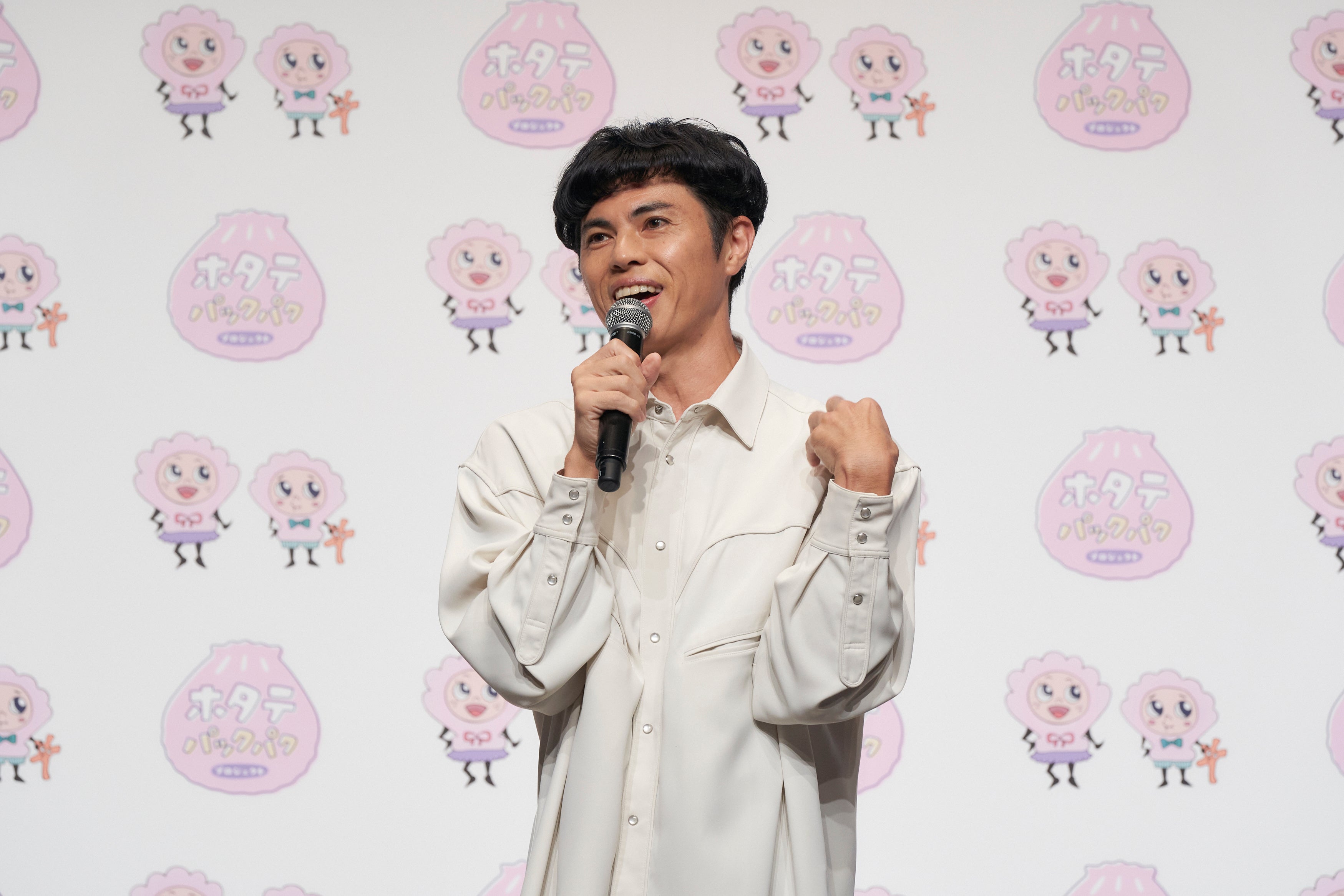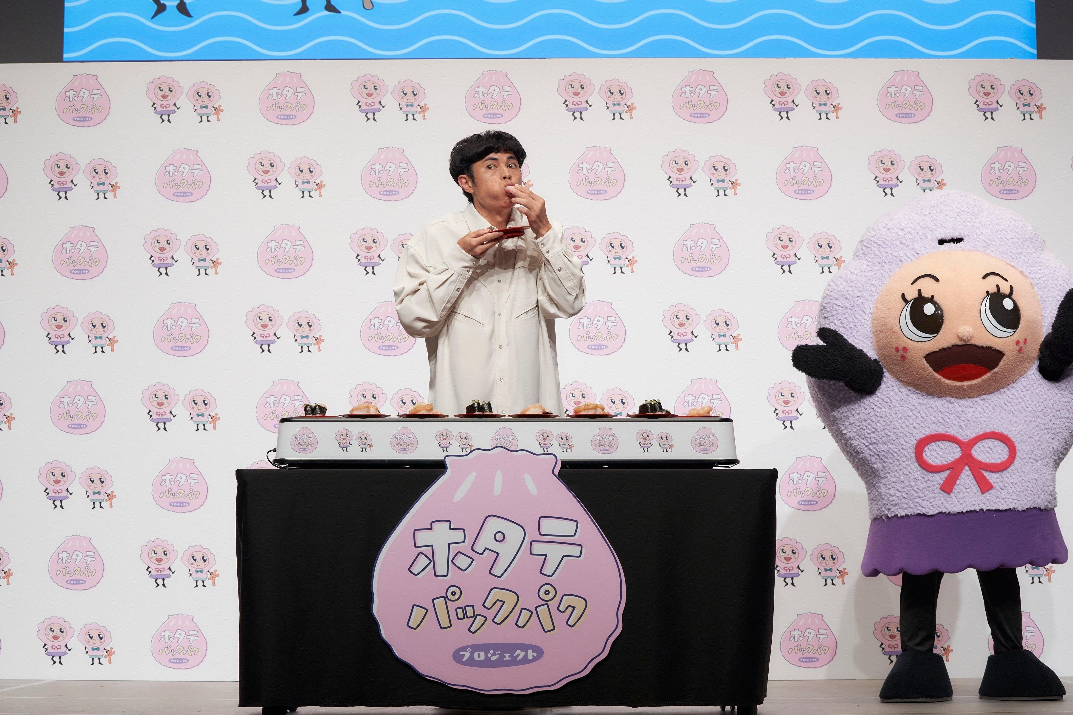 いつもの海パン姿ではなく、「ホタテをイメージした」という白シャツ×ピンクのパンツ姿で勢いよく登場した小島さん。「今日はホタテっぽく、でっぷりした髪型にしてもらいました。ここまでホタテに近づけるなんて相性いいですね。みんなにホタテの魅力を伝えられたらと思います!」と語り、イベントがスタートしました。この日が初披露目となったホタテ姉弟キャラクターのタッティちゃん&カイくんの印象を聞かれ、「めちゃくちゃ可愛らしいですよね!横から見ると顔が立体的になっているんですよね。栄養をたっぷり含んでいる感じが伝わります。」と絶賛しました。