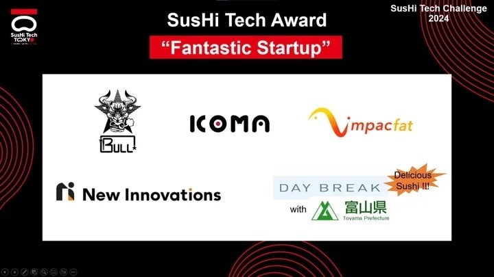 特殊冷凍テクノロジー事業を展開するデイブレイク株式会社(本社:東京都品川区、代表取締役:木下昌之)は、2024年5月15日および16日に開催されたアジア最大規模のグローバルイノベーションカンファレンス「SusHi Tech Tokyo 2024 Global Startup Program」に富山県と共同で「氷見の寒ブリの冷凍寿司」を特別出展。その品質や革新性が来場者から高く評価され、「SusHi Tech Award」の「Fantastic Startup」部門で表彰されました。