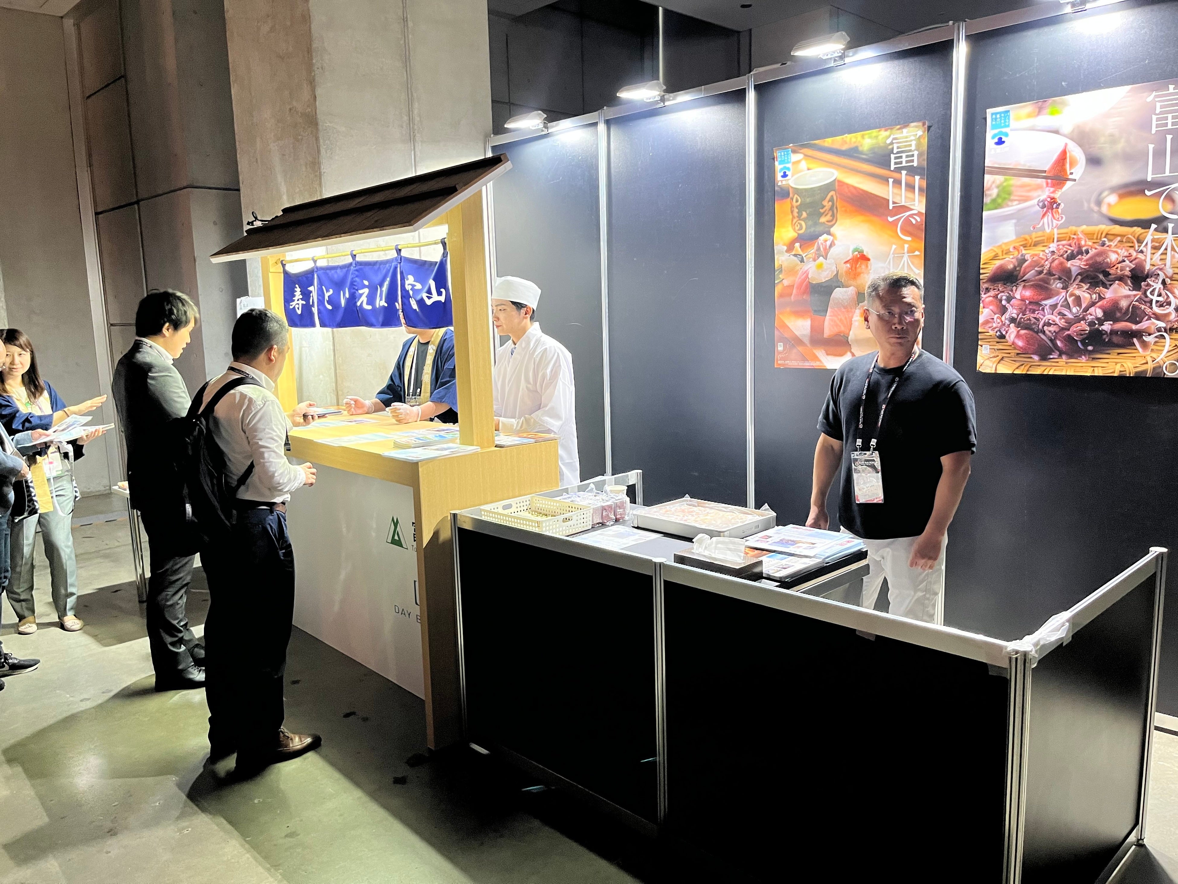 デイブレイクは、本カンファレンスにおいて富山県と共同で冷凍寿司を特別出展。富山県内の老舗魚問屋と共同で「氷見の寒ブリの冷凍寿司」を開発し、来場者に冷凍寿司を2日で4,000貫を振る舞いました。12、1月にしか獲れない寒ブリをとれたての状態で特殊冷凍して数ヶ月保管した後、出展時期に合わせて解凍して寿司を握り、再び特殊冷凍。会場まで冷凍輸送し、当日は会場の条件に合わせて解凍して提供しました。設備が限られる中で、10回近く解凍 / 試食を繰り返し、美味しく提供できるオペレーションを構築しました。