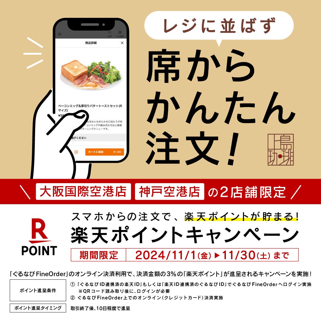 今回、上島珈琲店で実施する「楽天ポイント」キャンペーンは、2024年11月1日(金)から11月30日(土)までの1か月間、大阪国際空港店と神戸空港店の2店舗にて行われます。「ぐるなびFineOrder」のオンライン決済を利用することで、決済金額の3%分の「楽天ポイント」が進呈されるキャンペーンです。