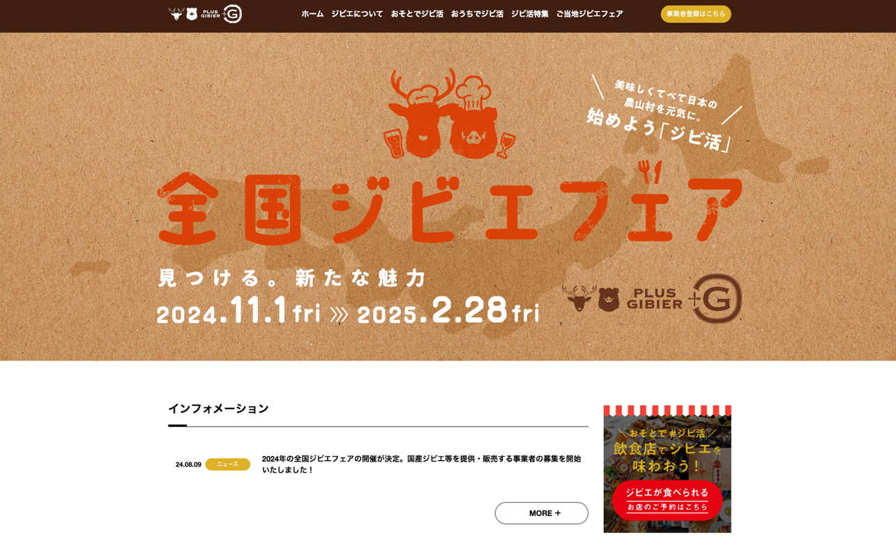 ぐるなびが開催して今年で4年目となる「全国ジビエフェア」では、ジビエの魅力を広く伝えるため、全国のジビエ提供店の情報や、ジビエイベント情報をはじめとした様々なコンテンツ情報を発信しています。