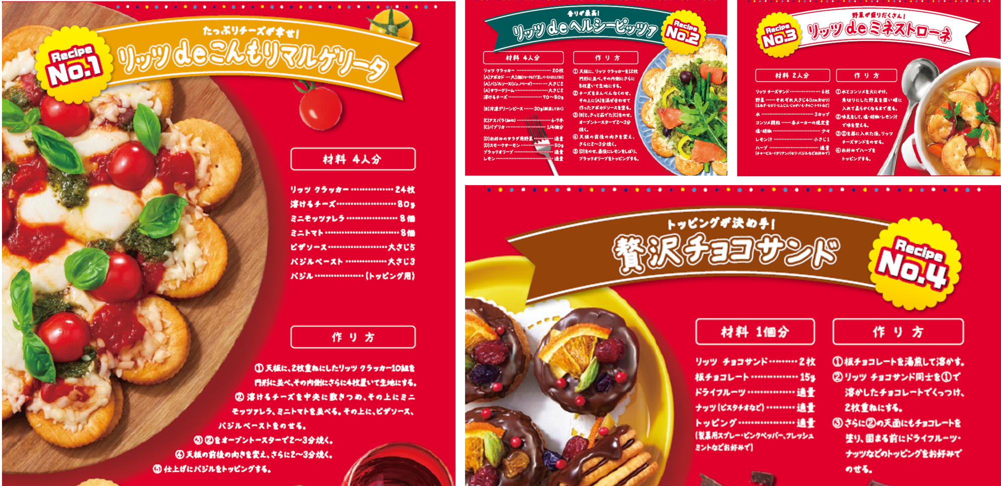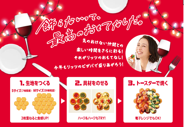 サクサクとした食感とほどよい塩味が特徴で、どんな具材とも相性抜群のクラッカー「リッツ」は、1971年に日本で発売されて以来、多くの方に親しまれているクラッカーブランド。今年は、「リッツがおいしく大変身!リッツdeピッツァパーティ!」と題し、生地作り・切り分け不要で簡単にピザが作れる「リッツdeピッツァ!」レシピと、ちょっとした工夫でリッツがスープやデザートに変身するレシピ全4種が登場!これだけでピザパを十分に楽しめます!