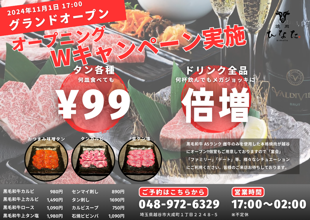 焼肉ひなたではグランドオープンを記念してWキャンペーンを実施いたします。