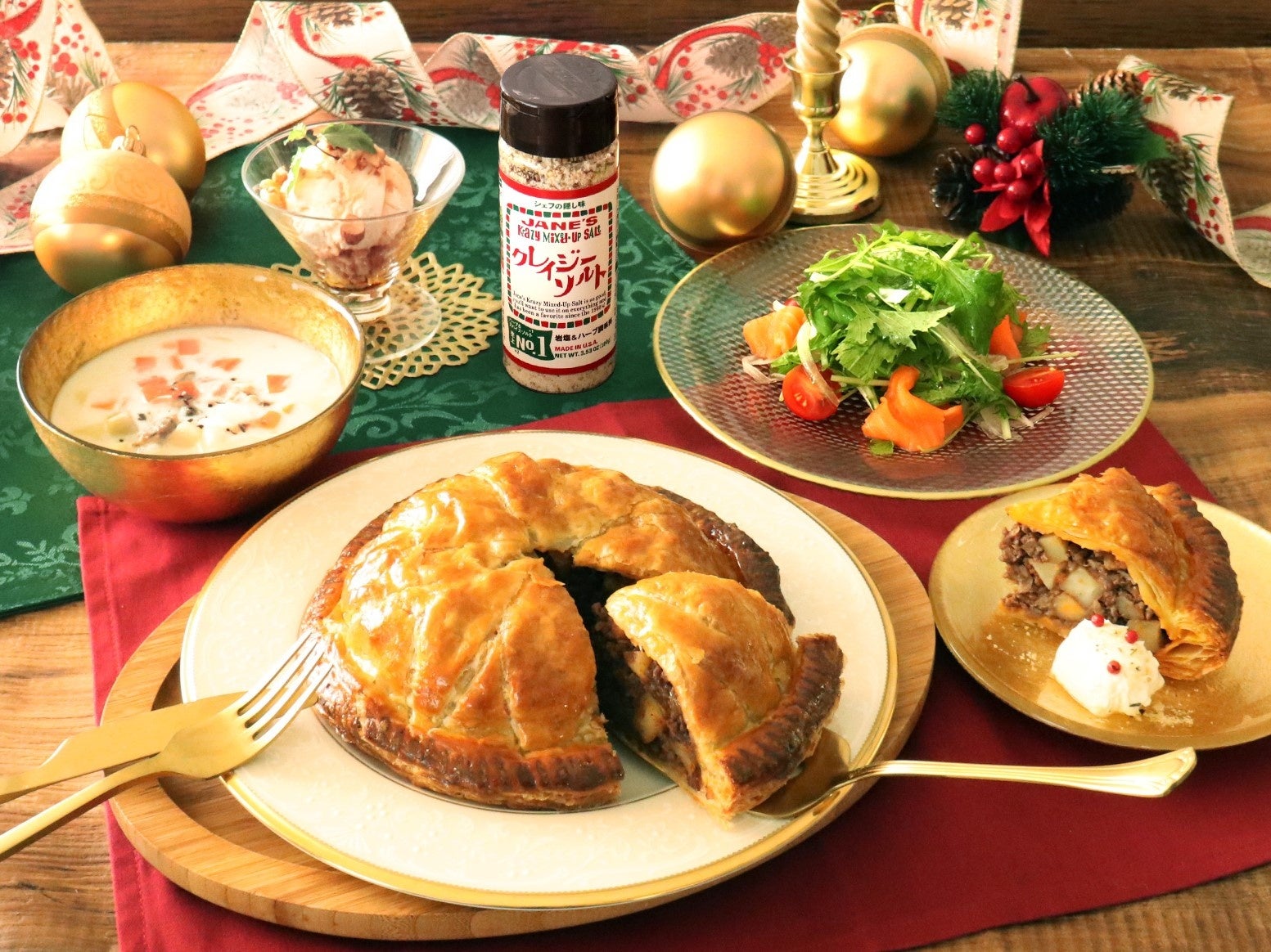 ホクホクしたじゃがいもと、トマトペーストで炒めた牛ひき肉を、6種のハーブ&スパイスとオニオンがブレンドされた『クレイジーソルト』で炒めてパイシートに詰め、200度のオーブンでじっくり焼き上げる、食べ応え満点のレシピ。