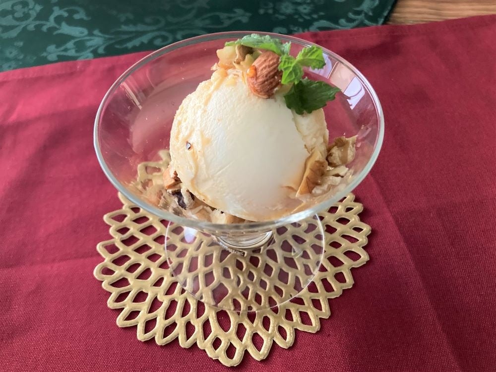デザートは、とっておきの隠し味が効いているバニラアイスクリーム。隠し味の『クレイジーソルト』を入れて煮立たせて作ったカラメルソースは、カラメル好きも唸る魅惑の味。岩塩、ブラックペッパー、タイム、オレガノの複雑な味わいがバニラアイスに彩りを添えます。