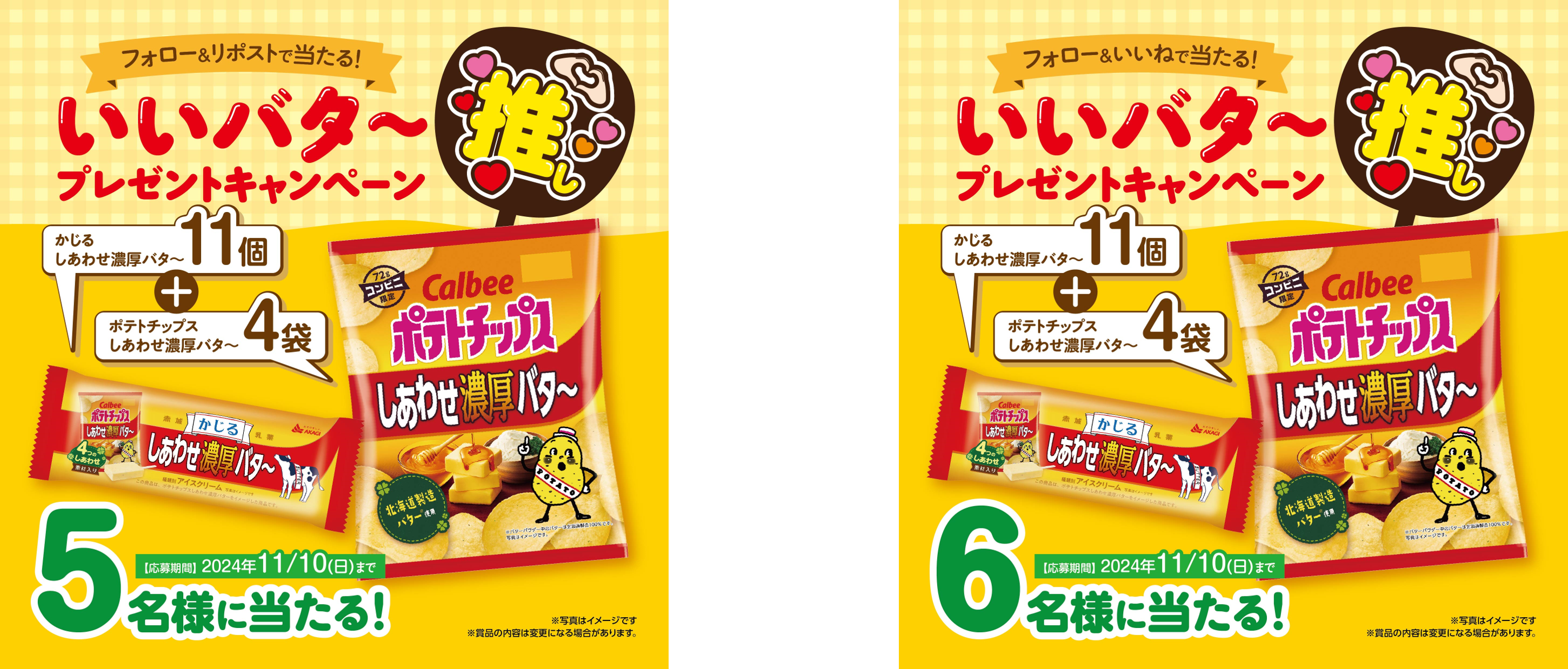 賞品:かじるしあわせ濃厚バタ~11個、ポテトチップス しあわせ濃厚バタ~4袋