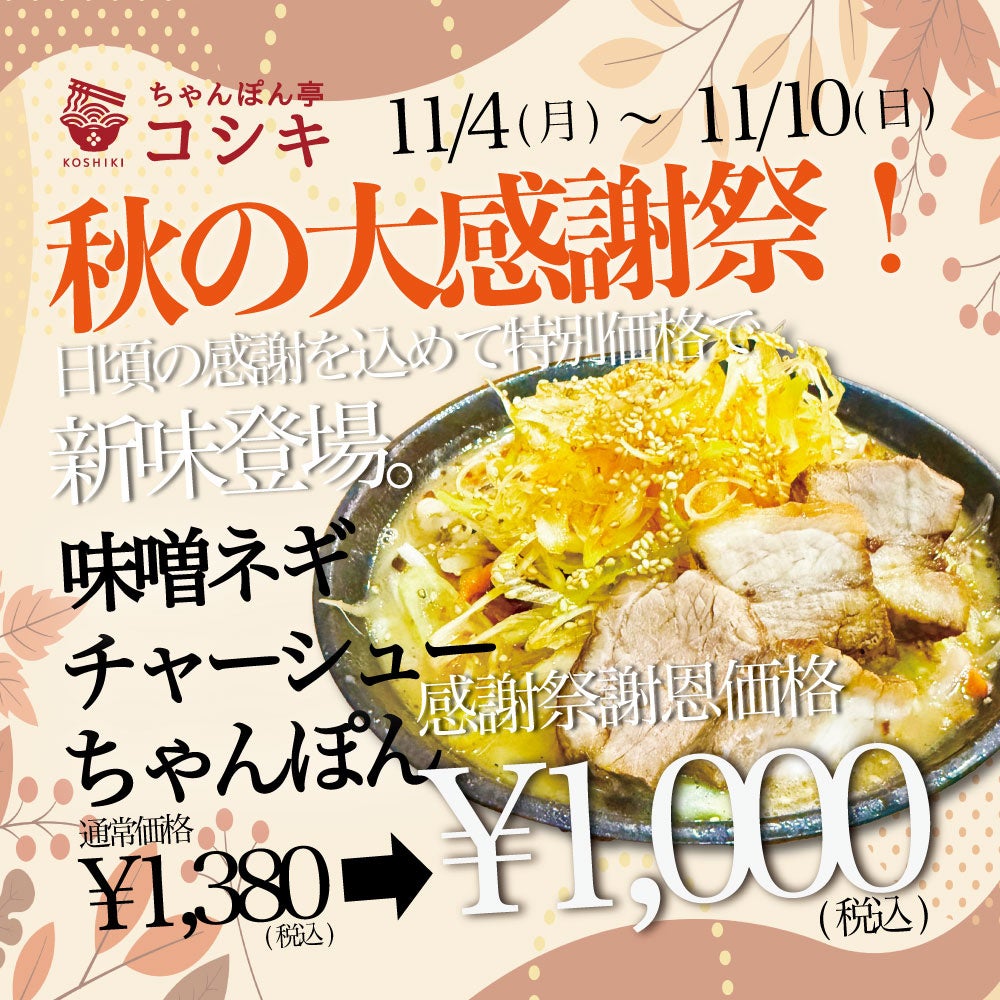 少し肌寒いこの季節にぴったりの「味噌ネギチャーシューちゃんぽん」とちゃんぽんの老舗が送る宴会コース「麺が主役のもつ鍋宴会コース」感謝祭特別価格でご提供いたします。