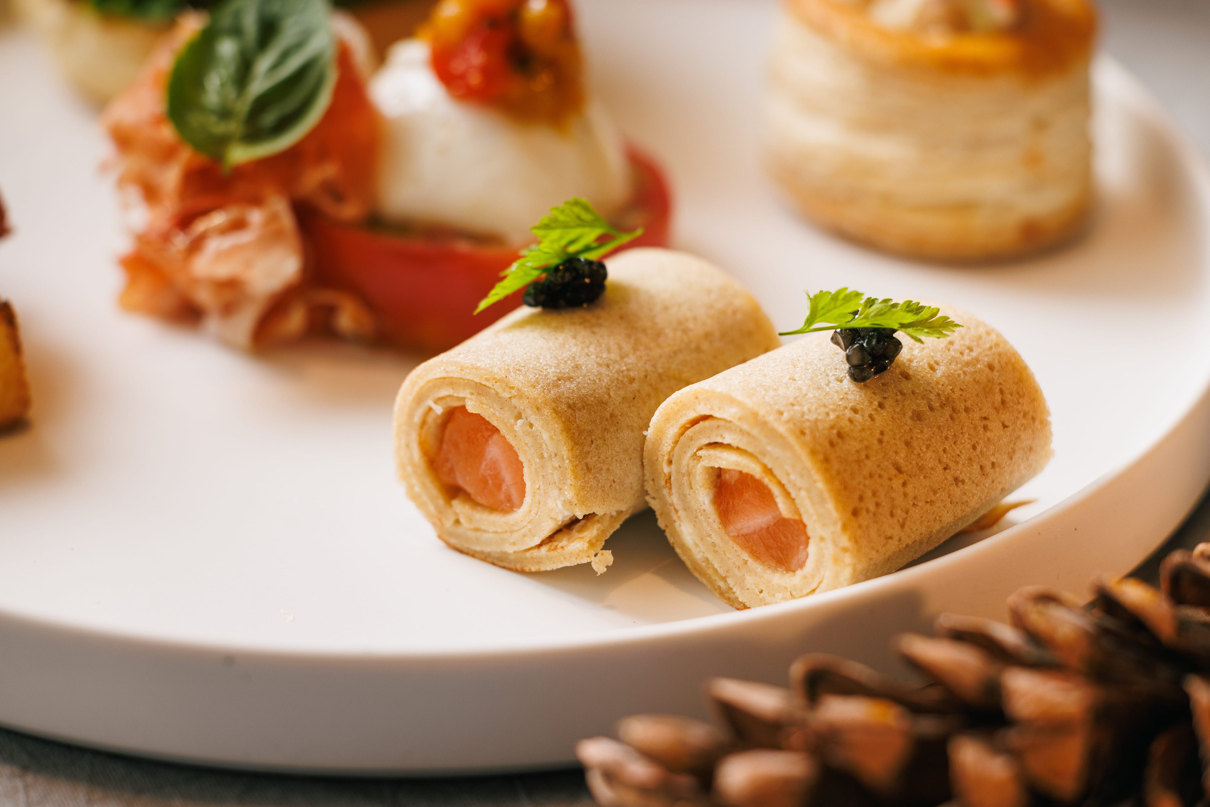 クレープ生地で包まれた、塩気の効いたスモークサーモンと爽やかなサワークリームのハーモニーをお楽しみいただける一品です。クリーミーさと酸味が絶妙に絡み合い、一口ごとに満足感が広がります。