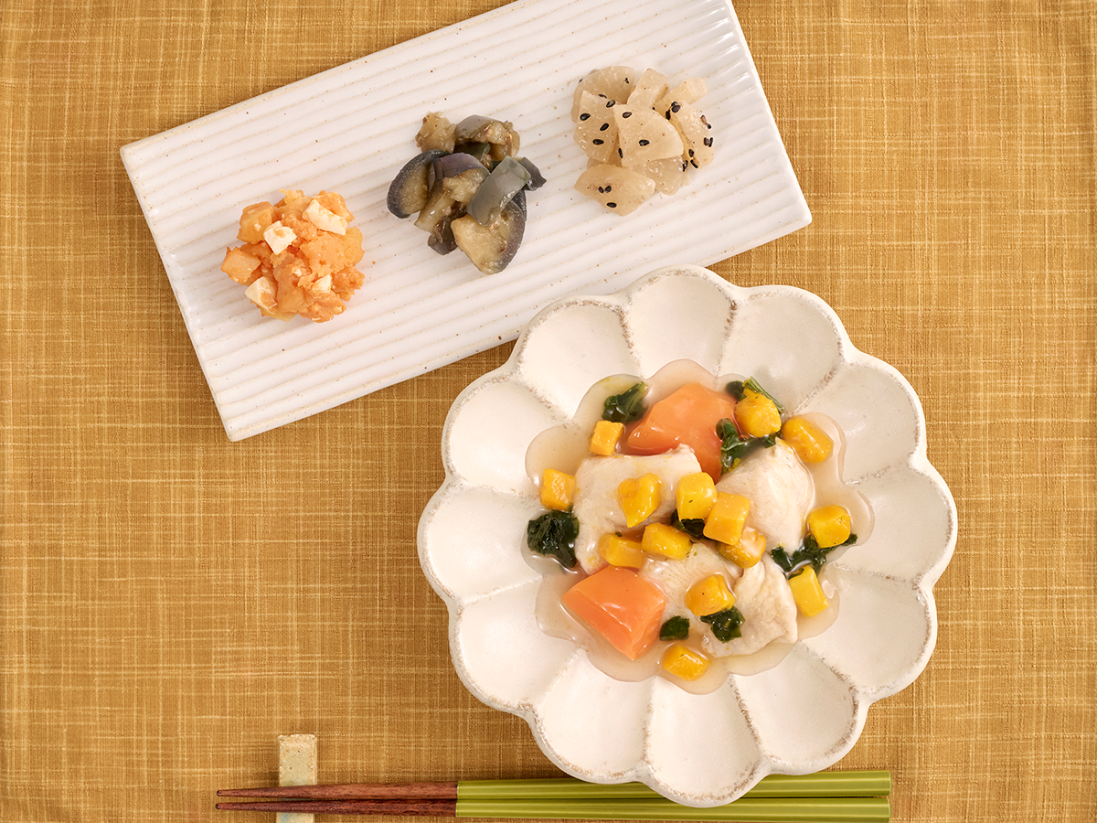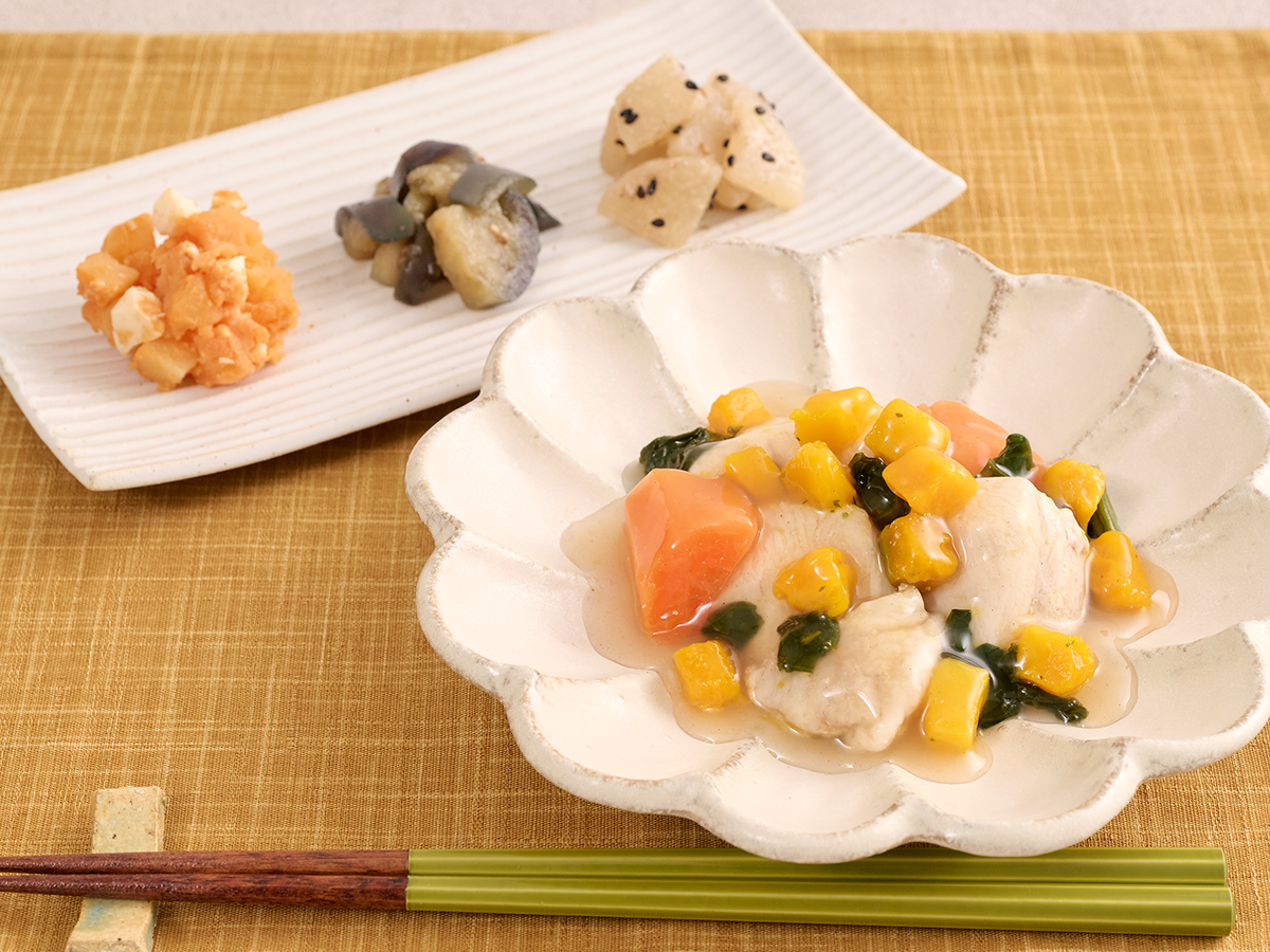 爽やかなわさび風味でいただく、ほっこり温まるメニューの登場です!石川県の郷土料理「鶏の治部煮」に着想を得て、鶏むね肉、人参、かぼちゃ、春菊、わさび菜にお出汁餡をかけた一品です。出汁の旨味で野菜も一緒に楽しんで頂けるように仕上げておりますので、ぜひ具材を特製の餡にたっぷり絡めて食べていただきたいです。 副菜はじゃがいも卵サラダ、なすのしそだれ、大根のごま和えです。