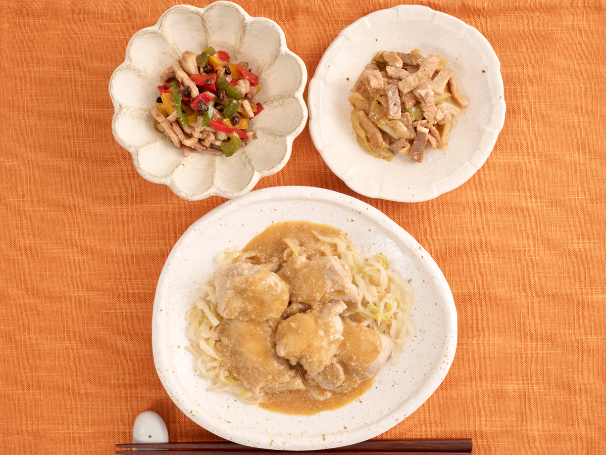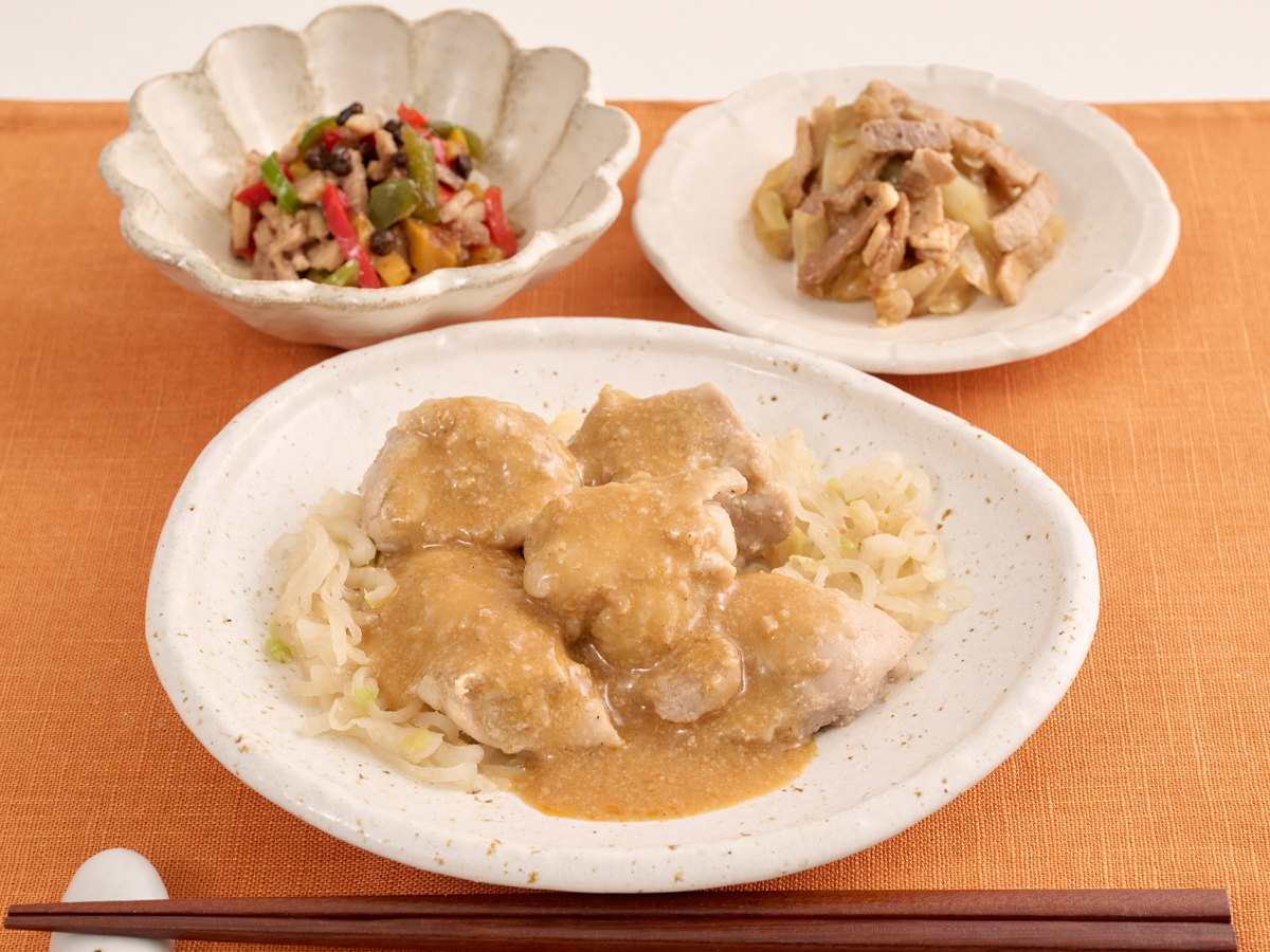 鶏、豚、牛の3種のお肉を使用し、健康的かつお肉をたっぷり堪能したい願望を叶えます!タンパク質は37.5gを実現し、タンパク質をとりたい方にもぜひおすすめしたいメニューとなっております!主菜は、ふんわりと焼き上げた鶏肉に、にんにくが効いたパンチのあるごまソースをたっぷり絡めています。どこを食べても、ごまの豊富な栄養素をしっかりと味わえる逸品です!副菜は、中華料理で使用される発酵調味料の「豆豉(とうち)」でコク深く仕上げた牛肉ピーマン、ピリリと辛味のあるミニ回鍋肉です。