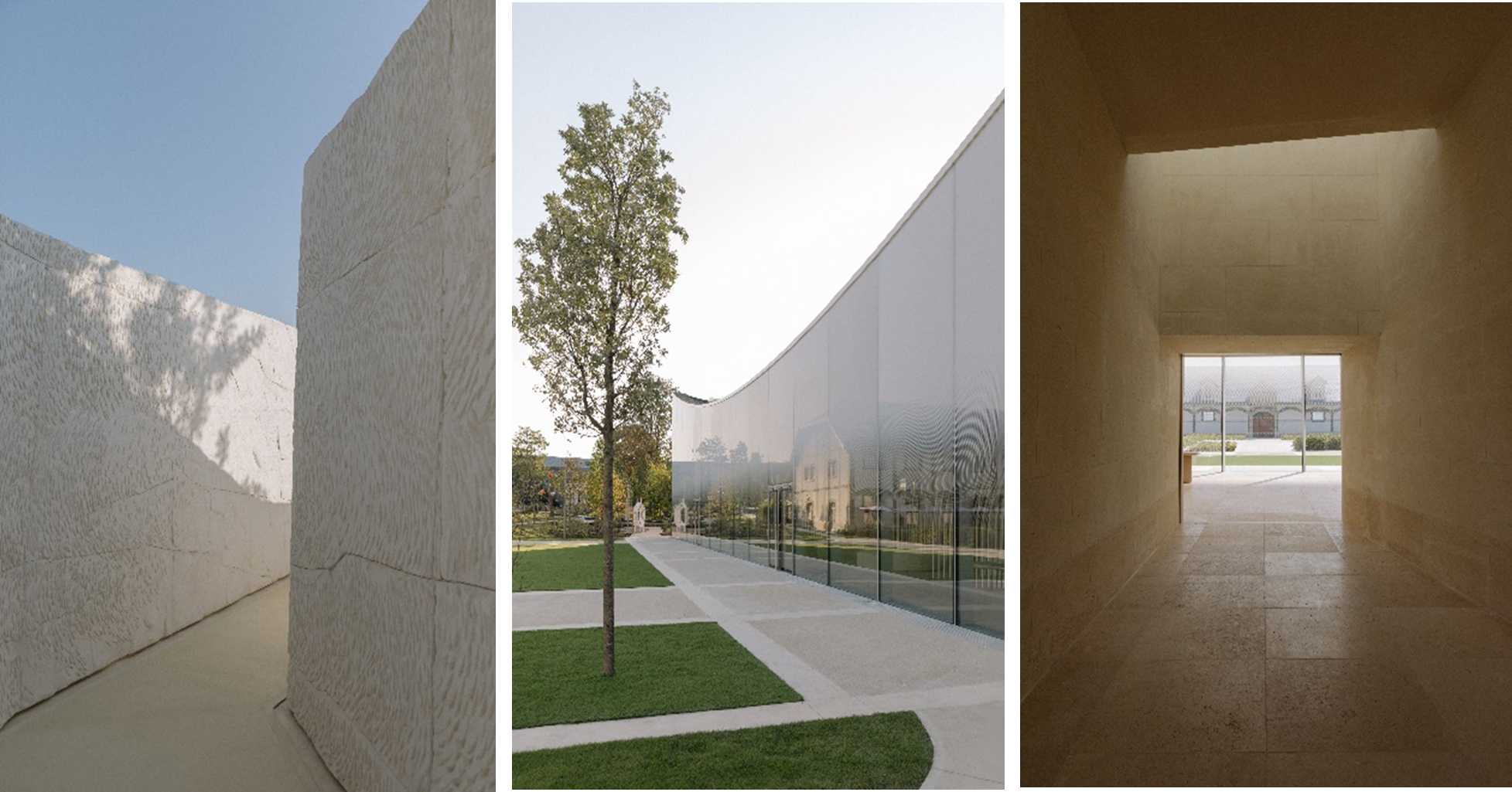 建築家の藤本壮介氏は、新たなパビリオンをいくつかのシークエンスに分けて空間をデザインしました。建物の顔となるエントランスホールは、クレイエルから伸びる小道の陰りと、ブドウ畑を養う陽光の コントラストをより一層際立たせています。天然色のベージュの壁に囲まれた広大な光のシャフトを通り抜けると、訪問者は絵画のように中庭の景色を縁取る巨大な出窓に直面します。庭に面する正面の壁をガラス張りにすることで、光によって彫刻された空間を演出しています。透明から霞がかった色合いへ徐々に変化していくガラスは、シャンパーニュから立ち上る泡を連想させ、メゾンの歴史を語る上で欠くことができない特別な場所を、時代を超越したイメージへと昇華させています。