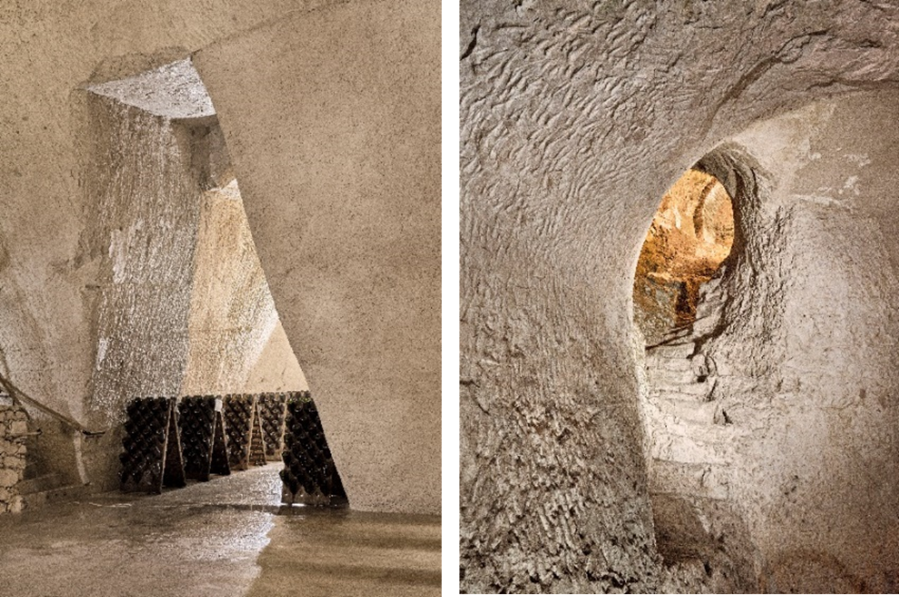 2015年、メゾン ルイナールの畑、丘陵、そしてセラーがユネスコの世界遺産に登録されました。ルイナール家は、19世紀にランスの高台にある2.9ヘクタールの土地を取得。この敷地の最大の特徴は、3層にわたって石灰層に掘られたギャラリーのある地下のレイアウトです。13世紀に掘削された地下回廊は、ランス市周辺の城壁建設に必要な白亜石灰岩を採取するために数世紀にわたって使用された歴史を有し、後にギャラリーとして整備され一般開放されています。「4 RUE DES CRAYÈRES」は、数千年の歴史を持つ白亜のセラーや指定森林地帯そしてワイン醸造など、ランスの地の特徴を集約させたものと言えるでしょう。木製の屋根を載せたこのパビリオンは、持続可能な世界に対するルイナールのコミットメントも体現。環境配慮の観点から、建物の壁や骨組みには地元で厳選された自然素材やバイオ素材を使用しています。雨水利用や緑化屋根の採用、強化断熱材やUVカットガラスを使用するなど、本プロジェクトはフランスの建築基準「HQE(High Quality Environmental)」の基準をすべて満たしています。さらに、敷地全体に地熱エネルギーとソーラーパネルを配置することで、エネルギーの80%を自給自足。革新性と環境に対する深い配慮も兼ね備えています。地元のソワソン石を使用した新パビリオンのオープンには、多くの地元の職人も参画。「Entreprise du Patrimoine Vivant(生きた遺産企業)」の称号を授与されている、ランスの熟練した石工であるレオン・ノエル氏は、採石から設置まで技術面における様々なフェーズで、多大な貢献を果たしました。