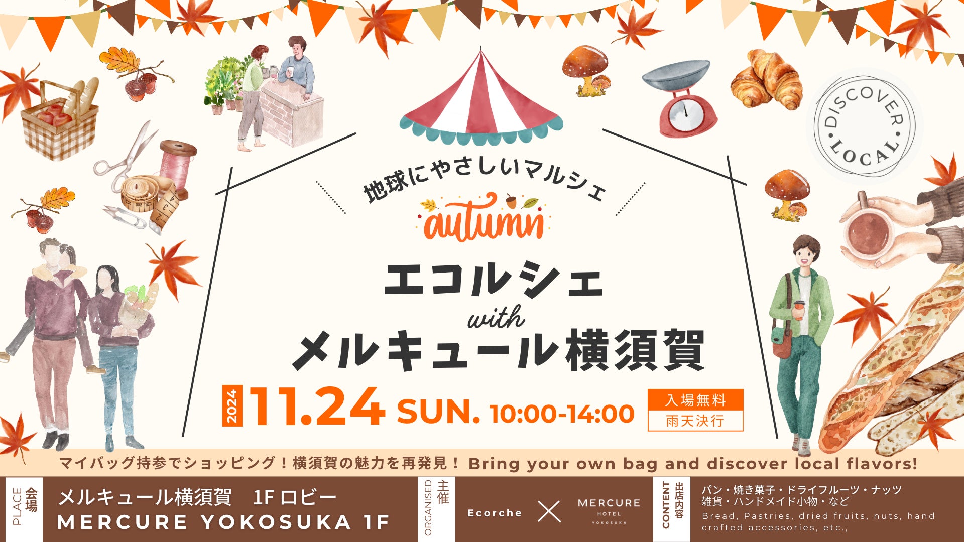 「メルキュール横須賀」(所在地:神奈川県横須賀市本町3-27 総⽀配⼈:⽵株枝⾥)は、神奈川県横須賀市を拠点に活動する「エコルシェ」(地球もわたしも元気になる合同会社 / 所在地:神奈川県横須賀市小川町19番地5 代表:神馬彩夏)と共同主催で、2024年11月24日(日)に「~地球にやさしいマルシェ~ エコルシェ with メルキュール横須賀~オータム~」を開催する。同マルシェは今年8月の開催に続き今回で2度目の共同開催となる。