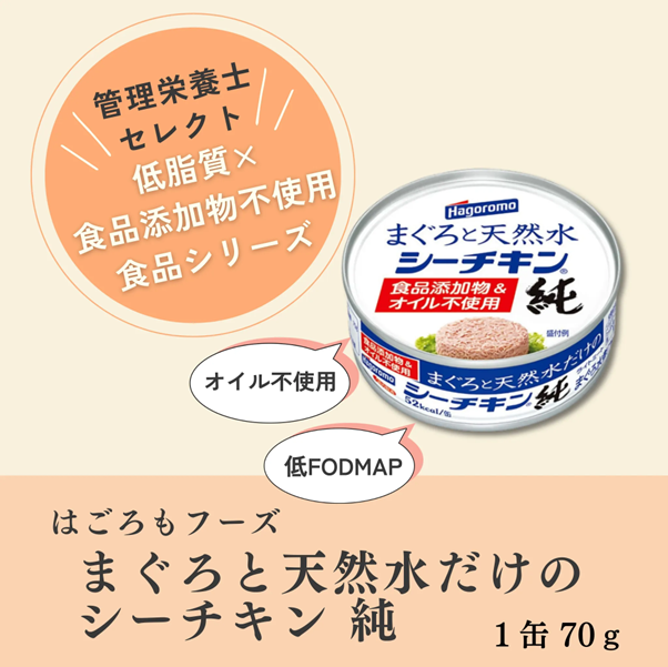 野菜エキスが気になる低FODMAP食中の方にも安心。まぐろと天然水だけで作られた商品です。