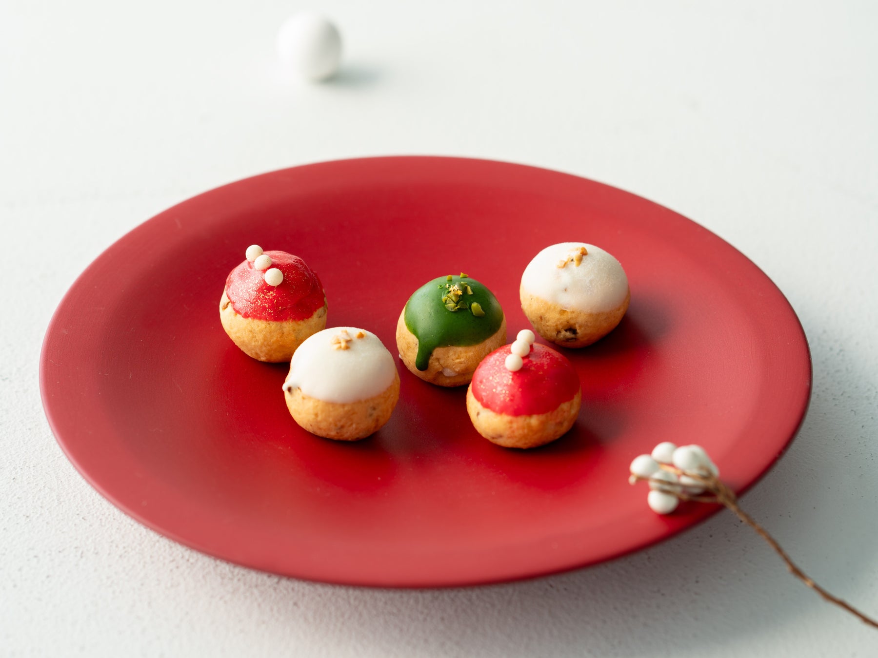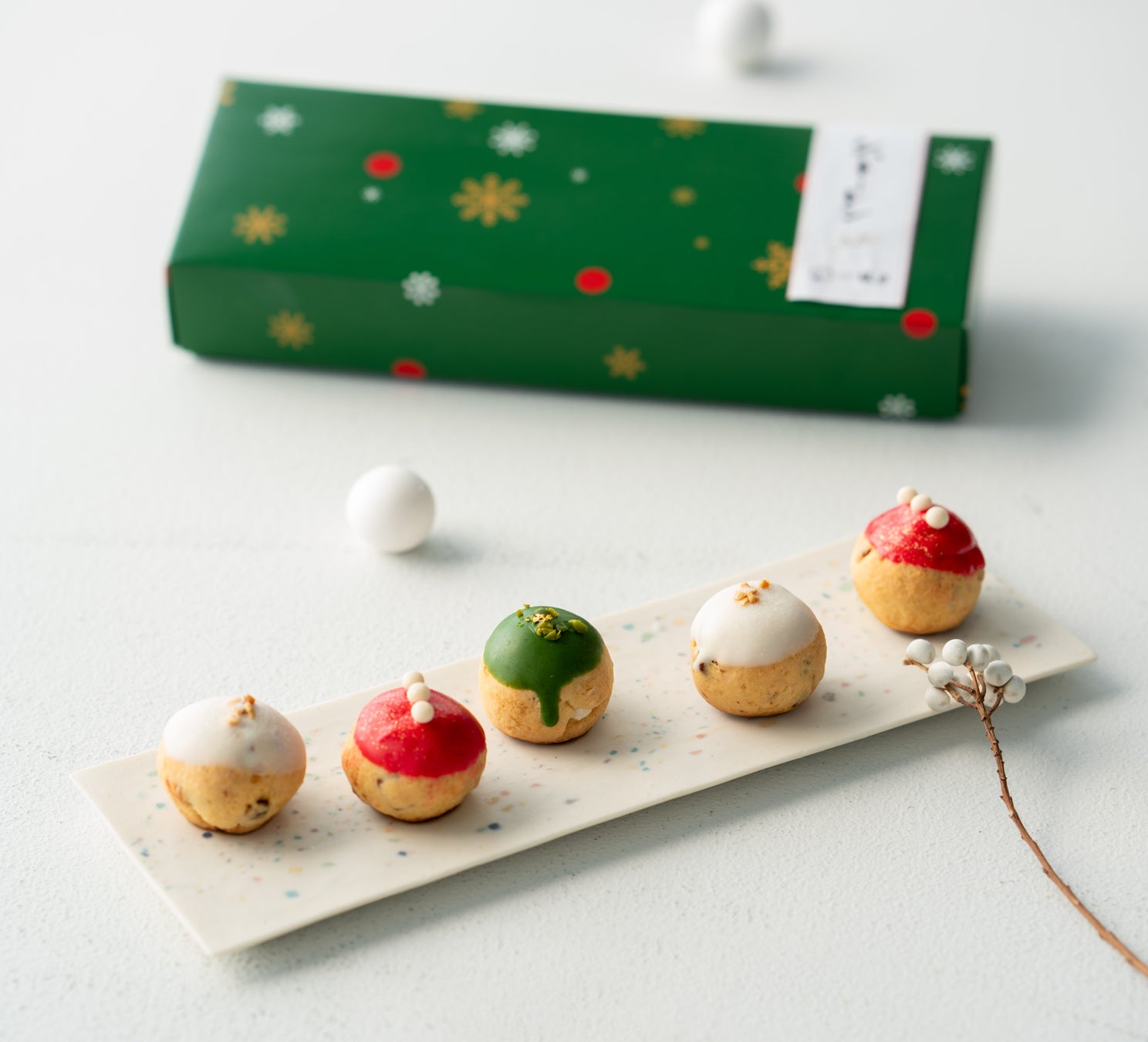 生地には、ドライフルーツ(オレンジピール、レーズン、チェリー、パイン、レモンピール等)を練りこみ、中身は刻み栗入りの風味豊かな栗餡をお入れいたしました。「サンタ(赤)」「雪(白)」「ツリー(緑)」の異なる3種類のトッピングをご用意しております。サンタは、ストロベリーチョコレートに金粉とチョコパーツをトッピングし、雪には、ホワイトチョコレートとローストアーモンドをトッピングいたしました。ツリーには、抹茶チョコレートにピスタチオ、金箔をトッピングいたしました。3種類どれも、中の栗餡のまろやかな味わいと果実の風味が口いっぱいに広がり、和の「シュトーレン」を味わうことができます。また、「シュトーレン」のパッケージは、クリスマスの手土産にしやすいように緑を基調とし、雪の結晶やオーナメント等、クリスマスツリーをイメージしたデザインになっております。「いつもと違ったクリスマスにしたい!」「手土産で差をつけたい!」という方におすすめの商品です。